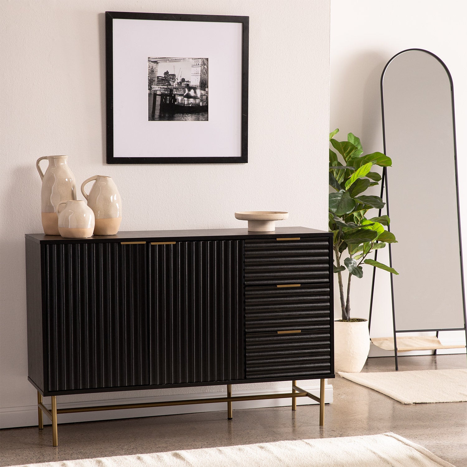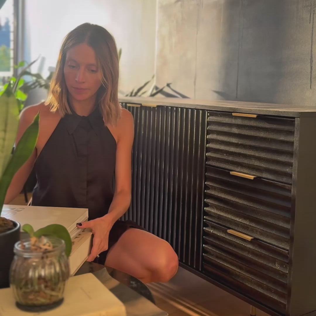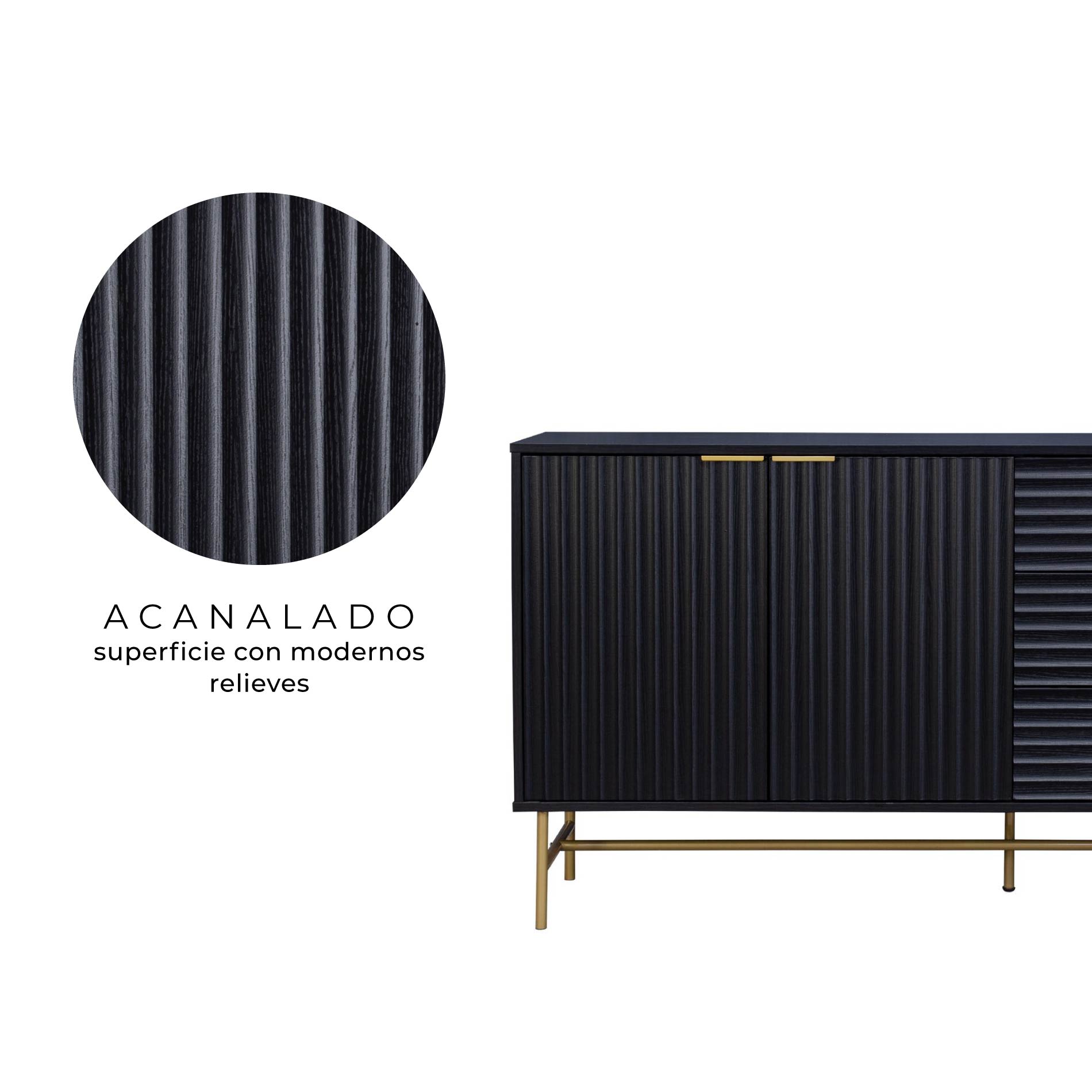 Incorpora elegancia y estilo a tu hogar con este moderno bife vajillero. Su diseño funcional, con amplio espacio de almacenamiento, combina tonos oscuros con sutiles detalles dorados, creando un mueble contemporáneo y sofisticado que realza cualquier ambiente.