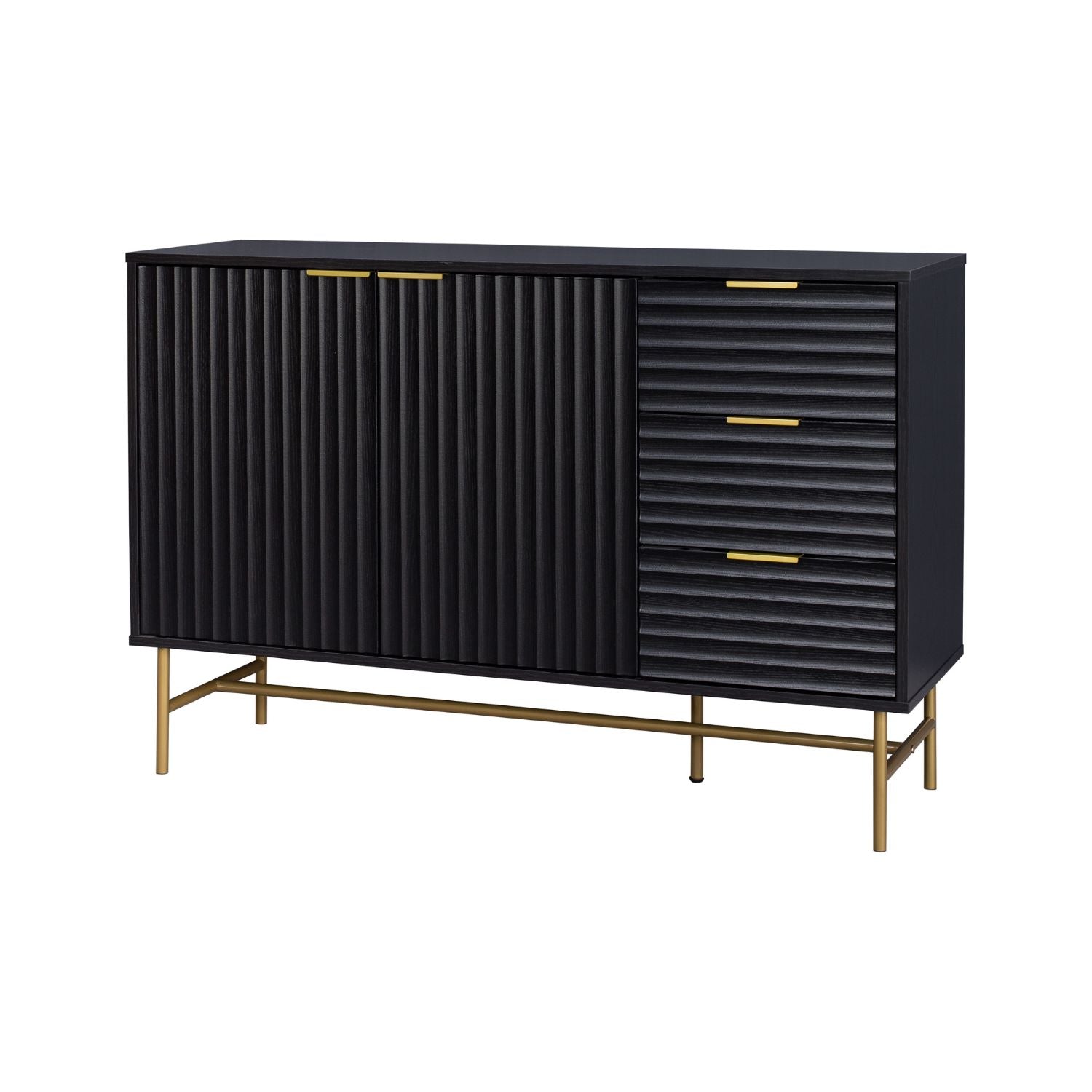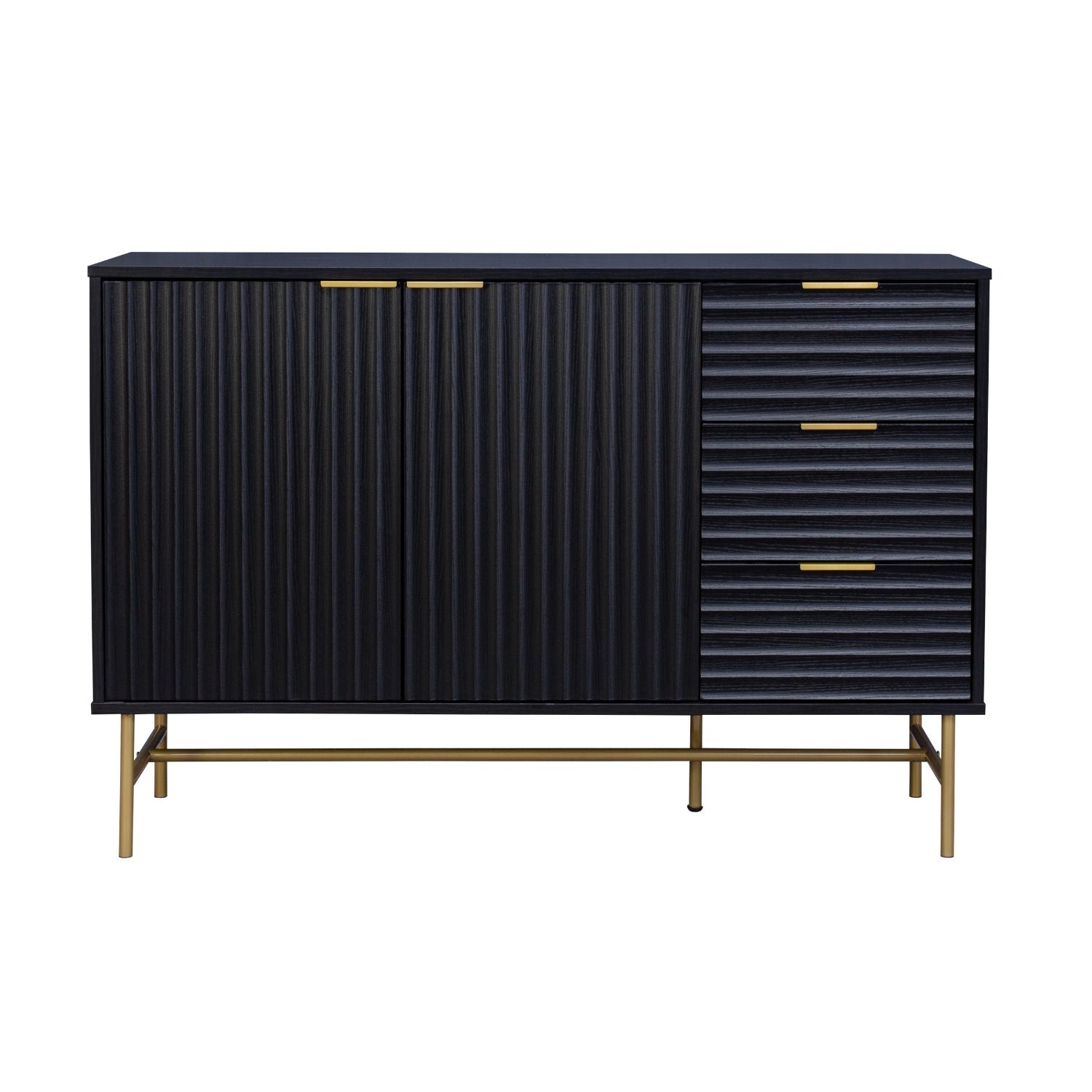 - Cuenta con 2 puertas con estante interior y 3 cajones laterales con correderas metálicas, todos con manijas doradas de aleación de aluminio.
