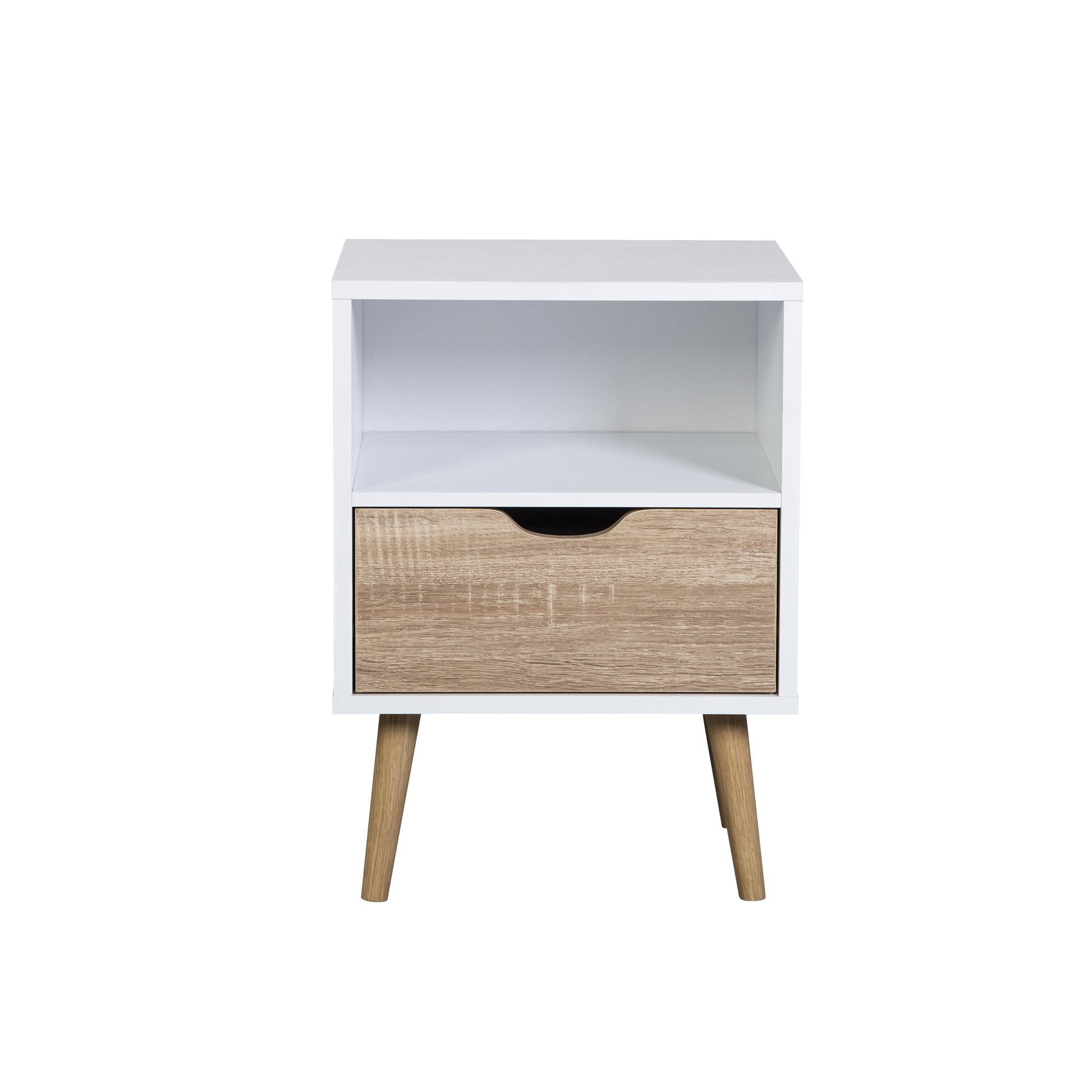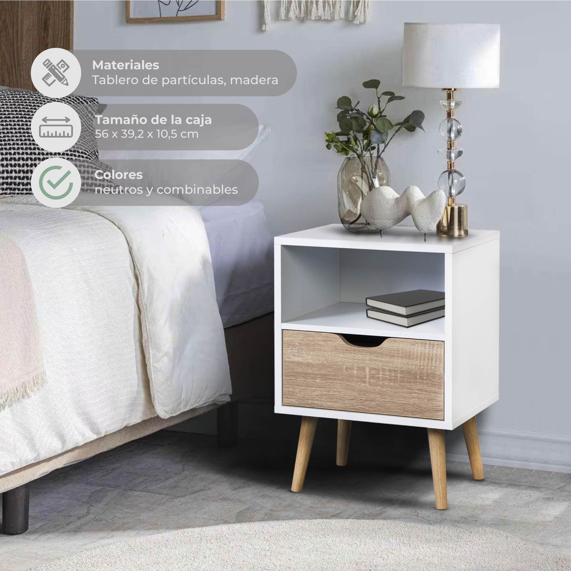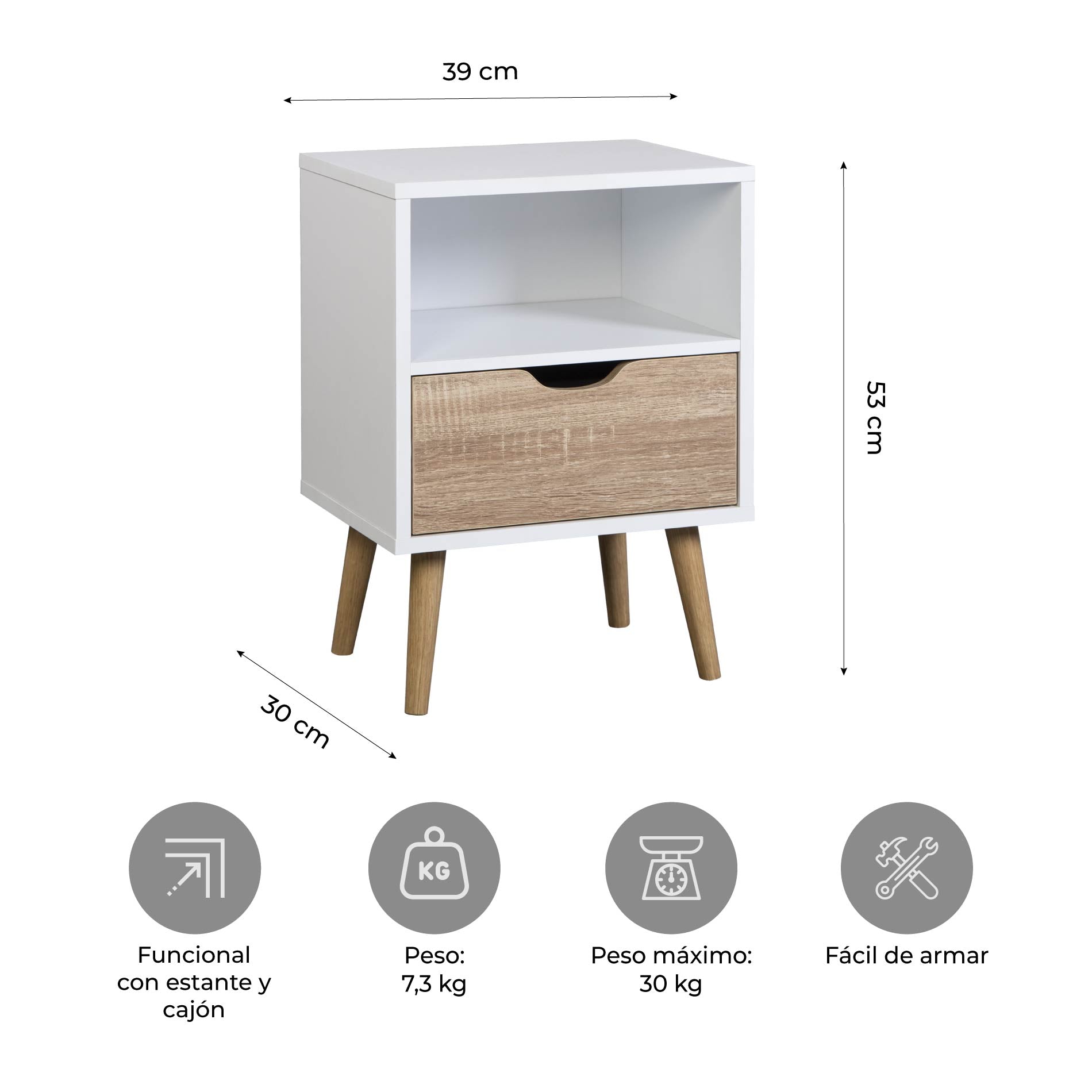Disfruta de esta moderna mesa de noche estilo nórdico en tonos madera clara y blanco en tu hogar. Gracias a su diseño minimalista y versátil podrás utilizarlo como mesa de noche para tu recámara o como mesa auxiliar en tu sala. Suma diseño a tu hogar y dale un toque cálido a tus espacios con este práctico buró.