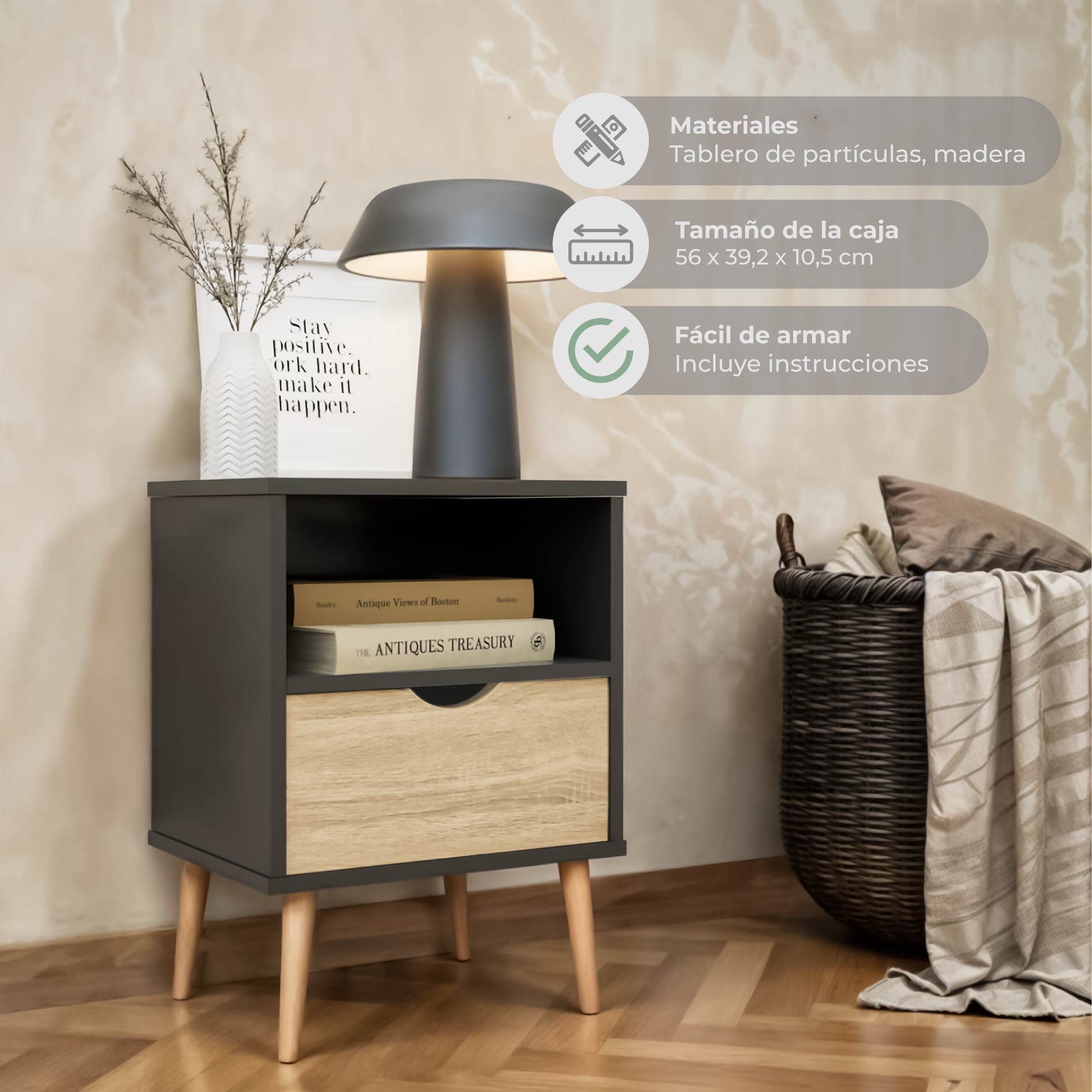 - Materiales: estructura de tablero de partículas con papel y patas de madera maciza, materiales de alta calidad.