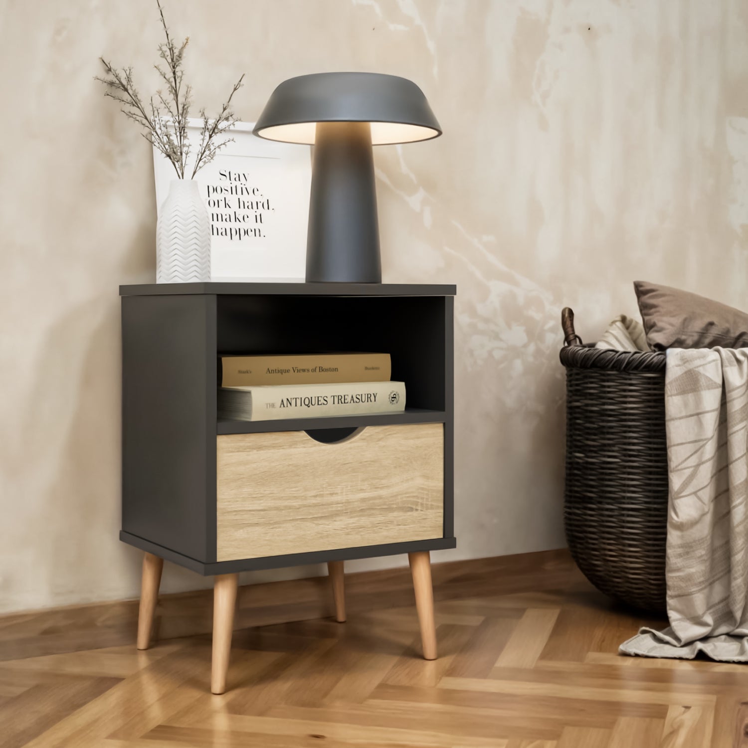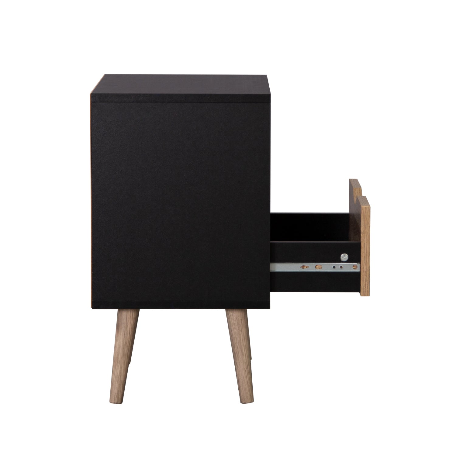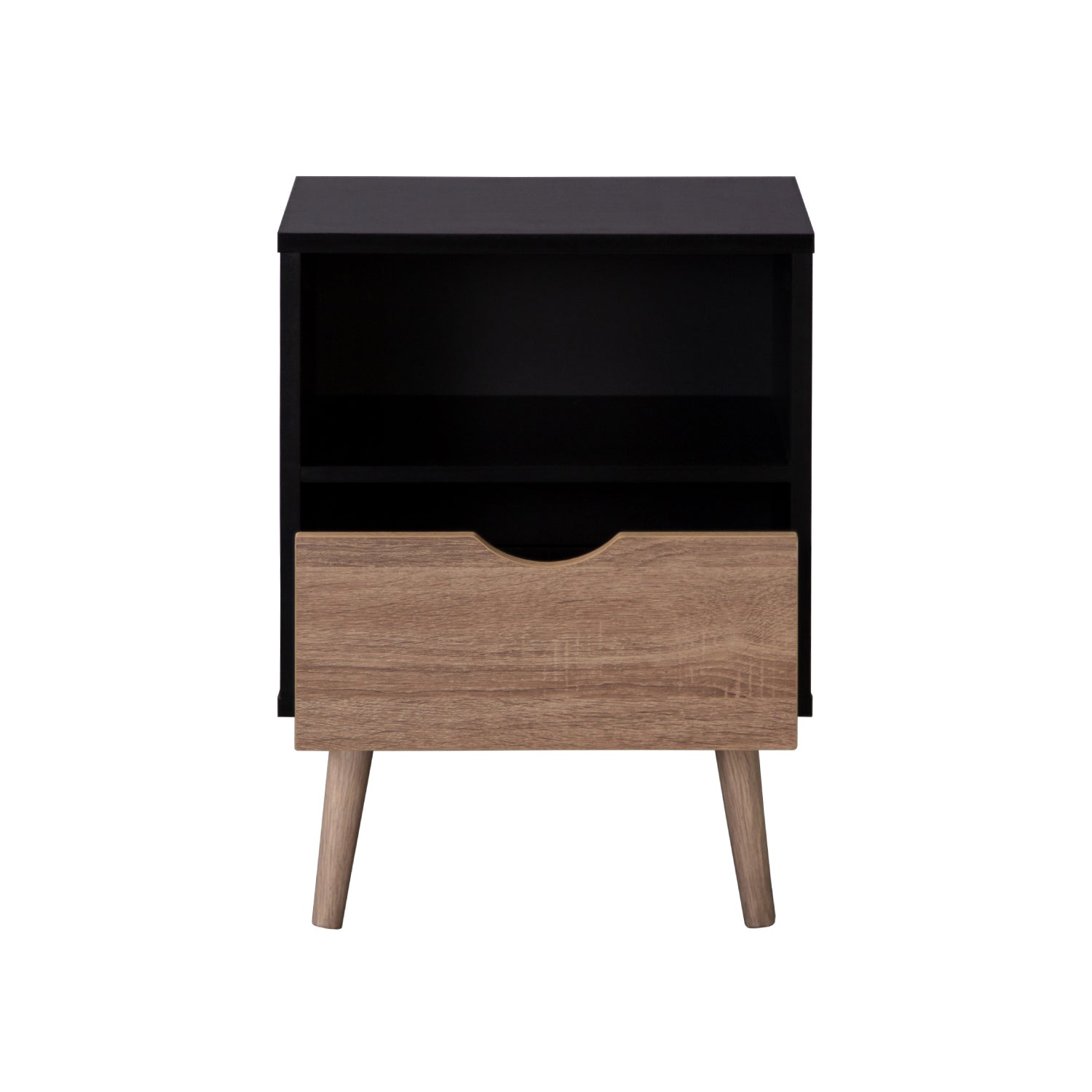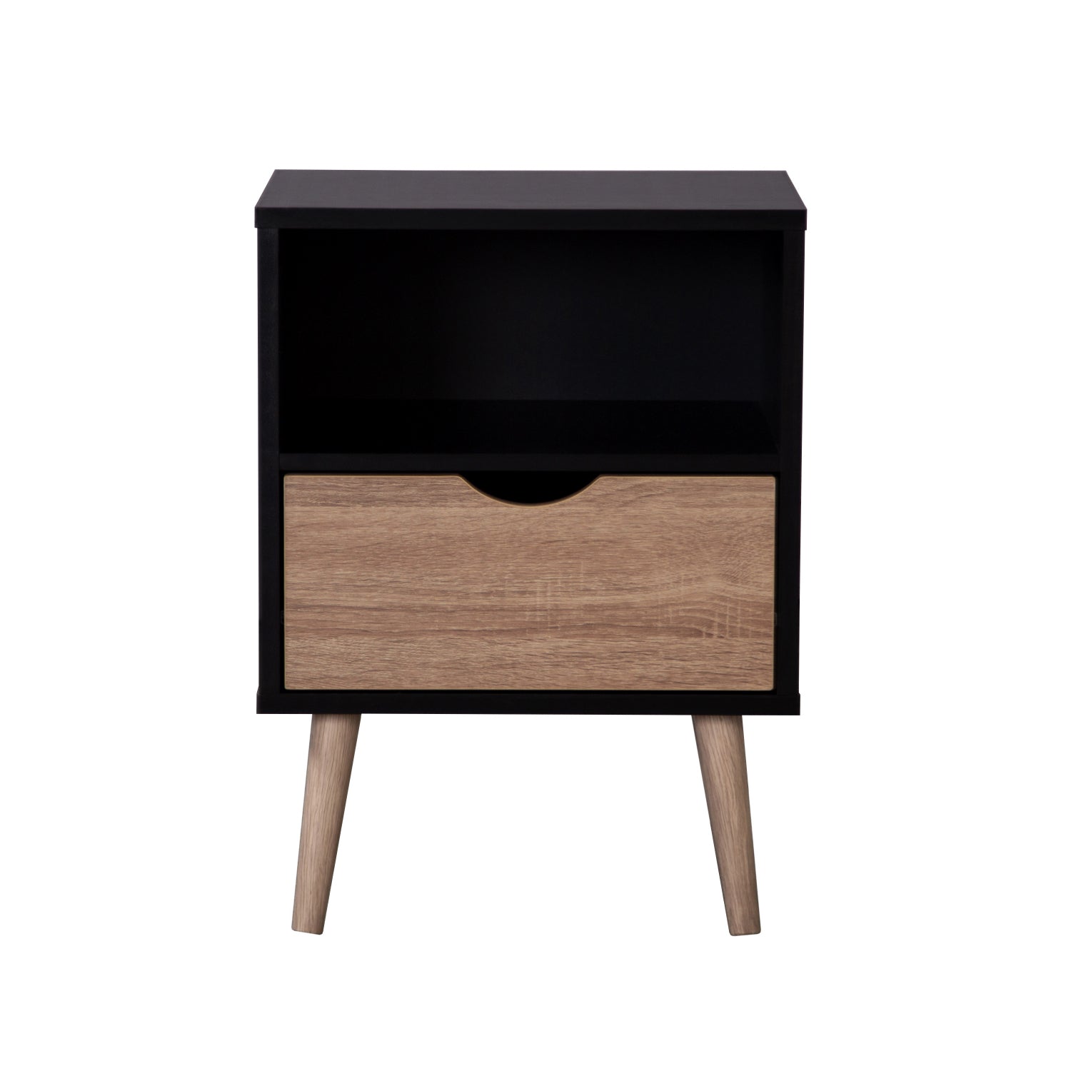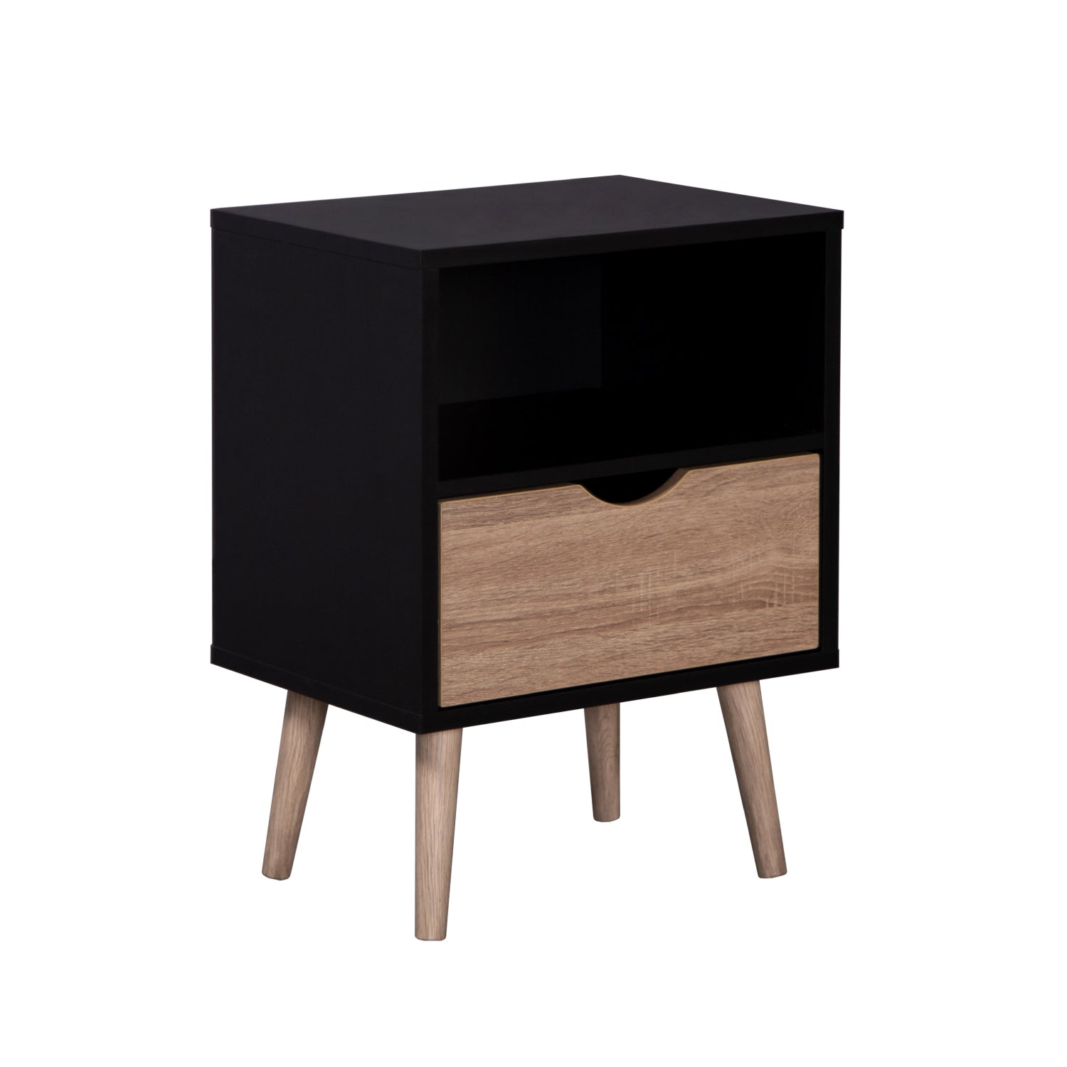 Disfruta de esta moderna mesa de noche estilo nórdico en tonos madera clara y negro en tu hogar. Gracias a su diseño minimalista y versátil podrás utilizarlo como mesa de noche para tu recámara o como mesa auxiliar en tu sala. Suma diseño a tu hogar y dale un toque cálido a tus espacios con este práctico buró.