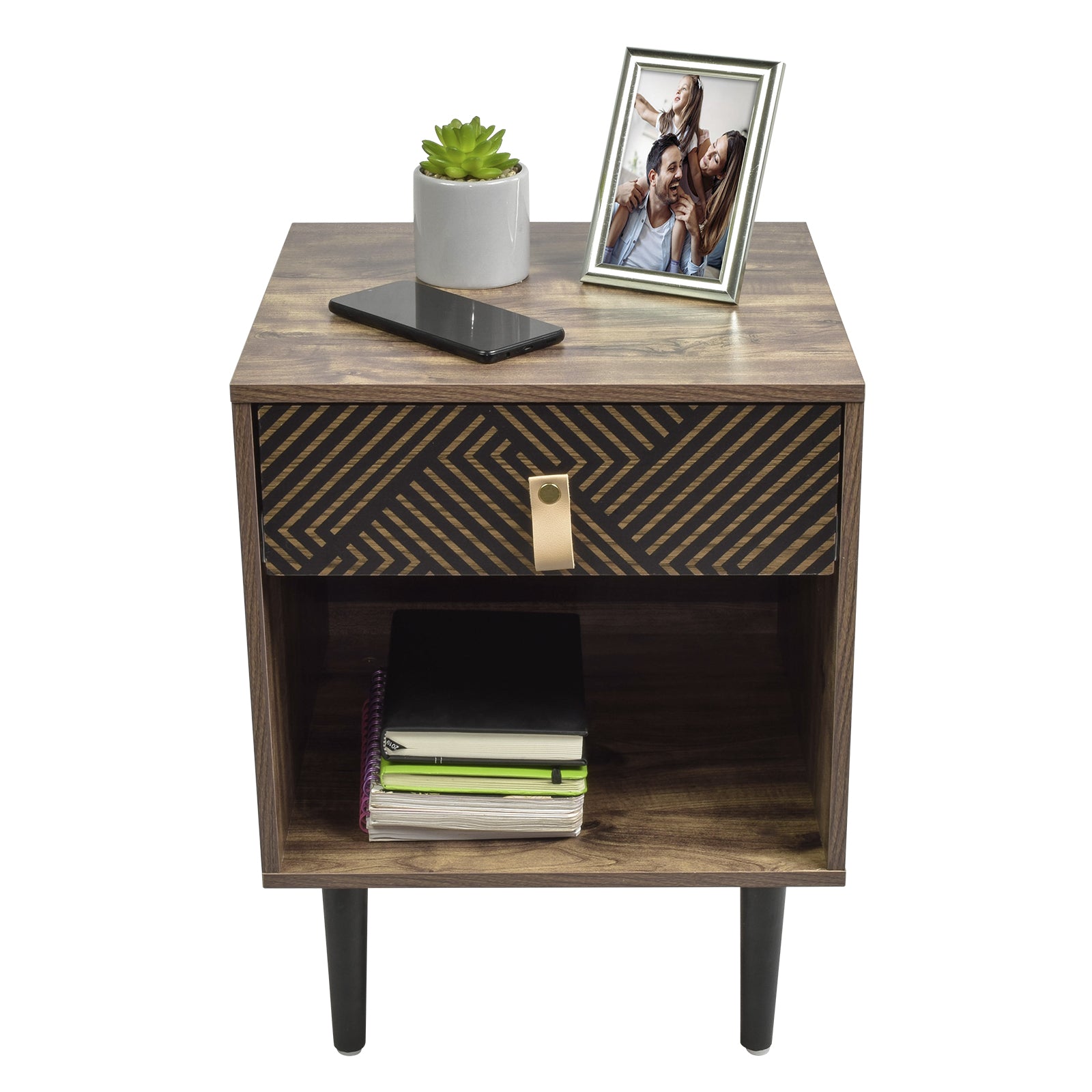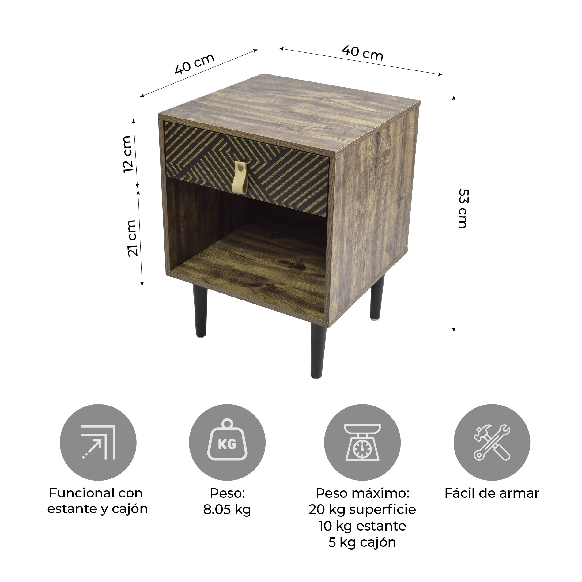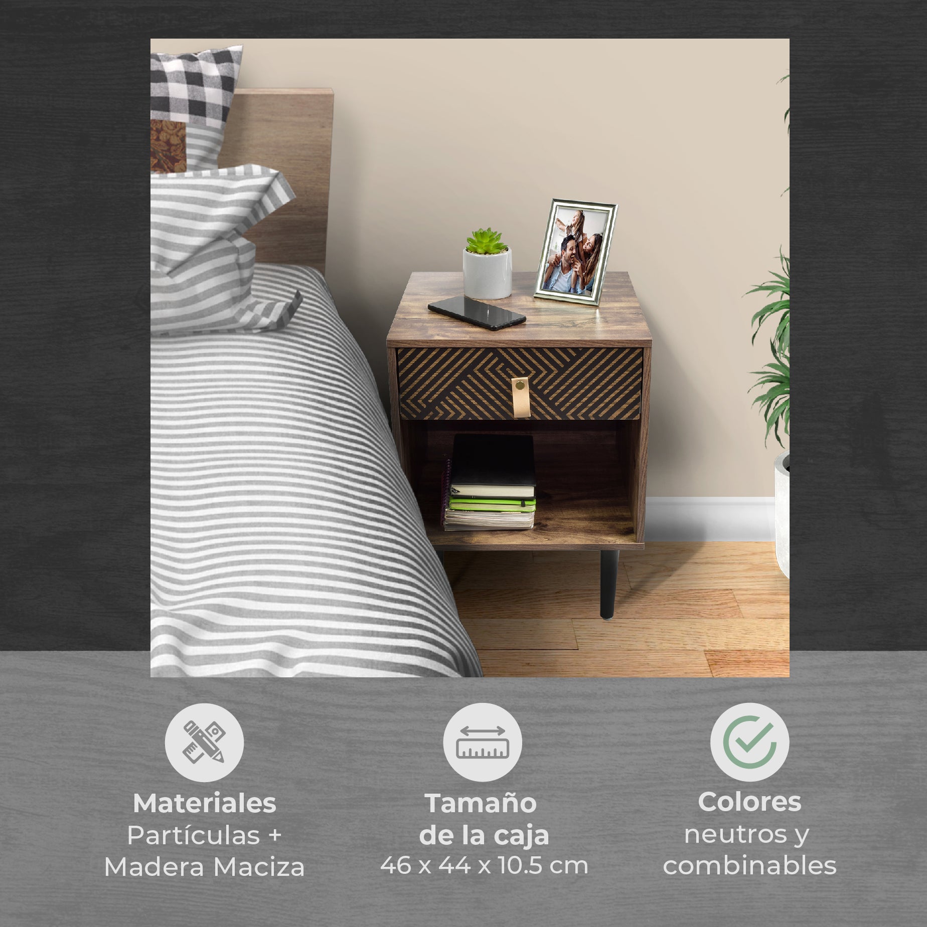 Disfruta de esta moderna mesa de noche en tonos café y negro con cajón y entrepaño. Suma diseño a tu hogar y dale un toque diferente a tus espacios, gracias a su versatilidad podrás utilizarlo como mesa de noche o mesa auxiliar.