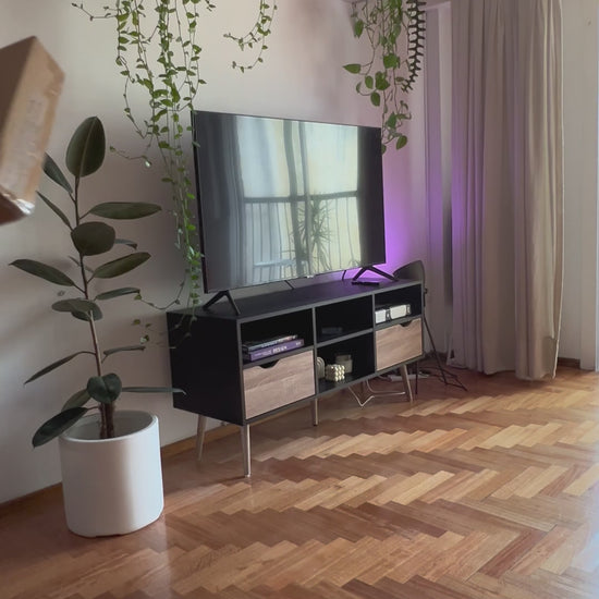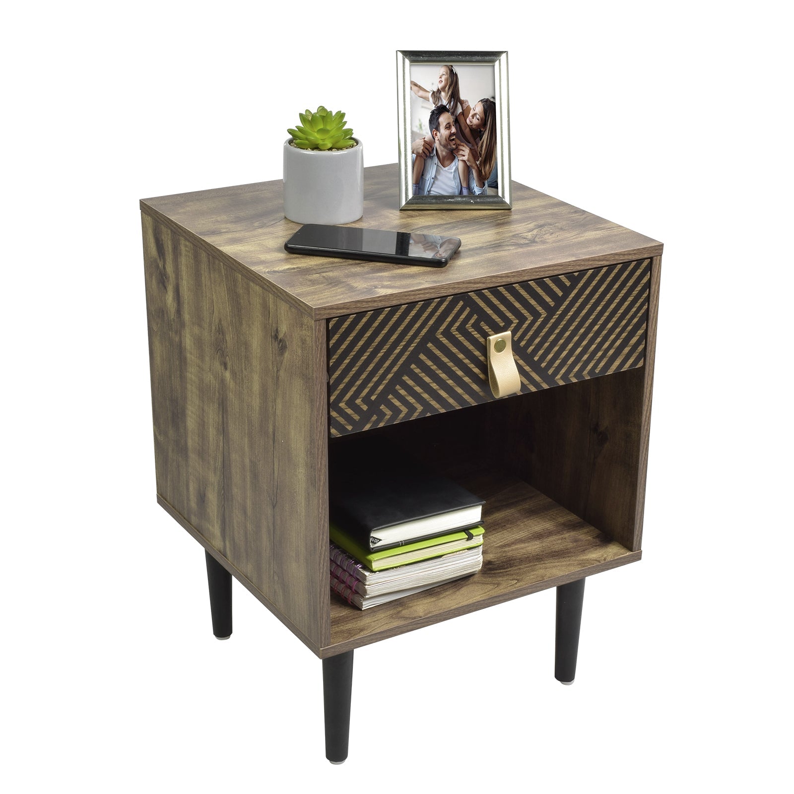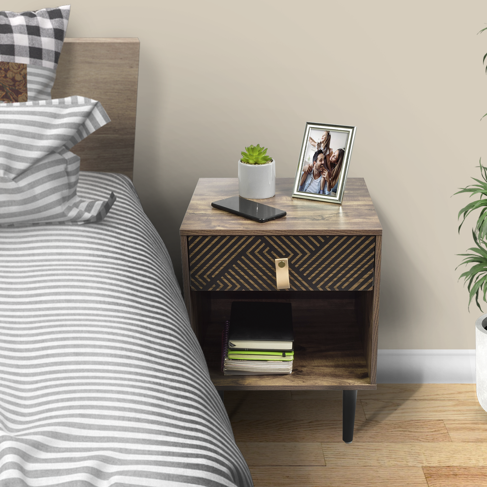 Disfruta de esta moderna mesa de noche en tonos café y negro con cajón y entrepaño. Suma diseño a tu hogar y dale un toque diferente a tus espacios, gracias a su versatilidad podrás utilizarlo como mesa de noche o mesa auxiliar.