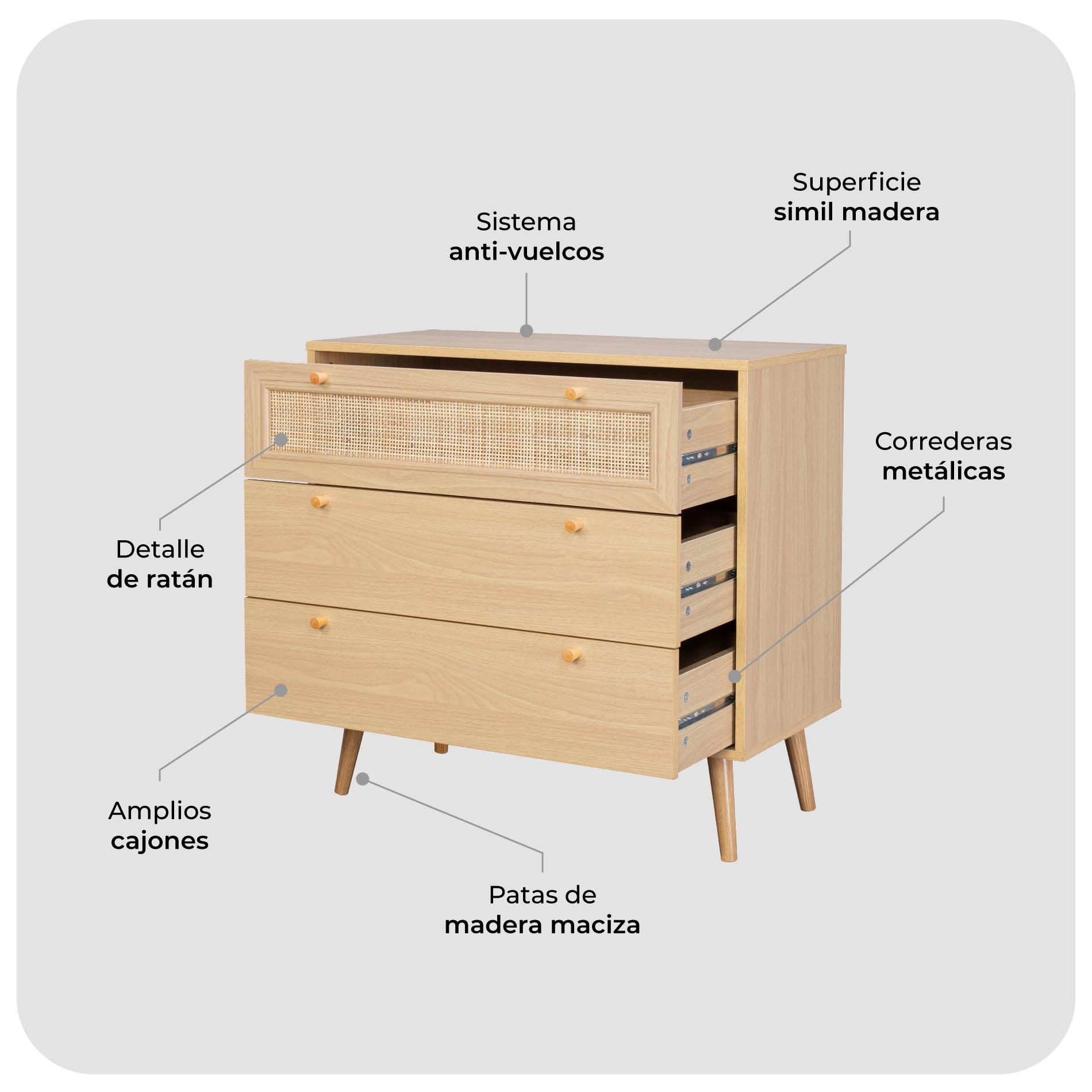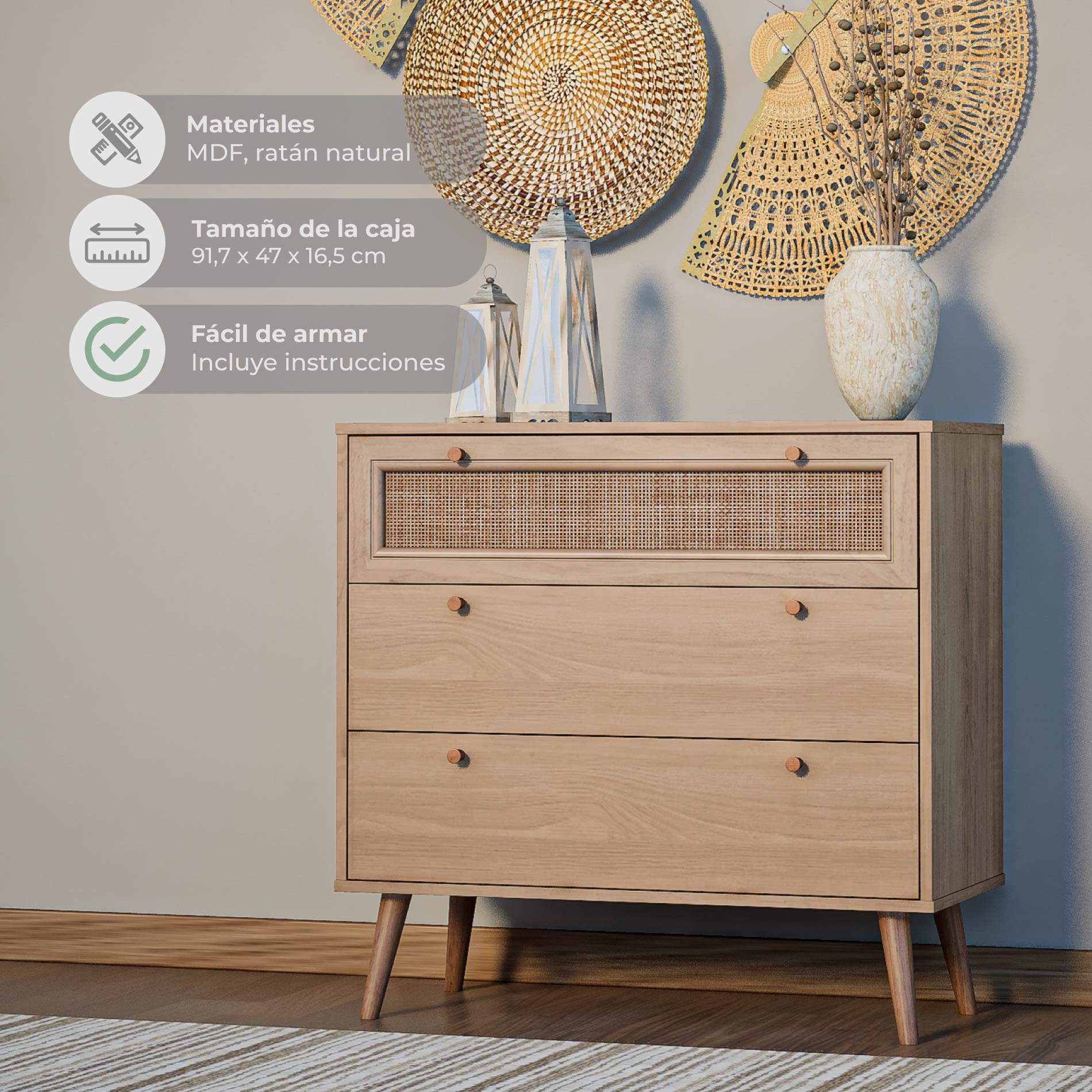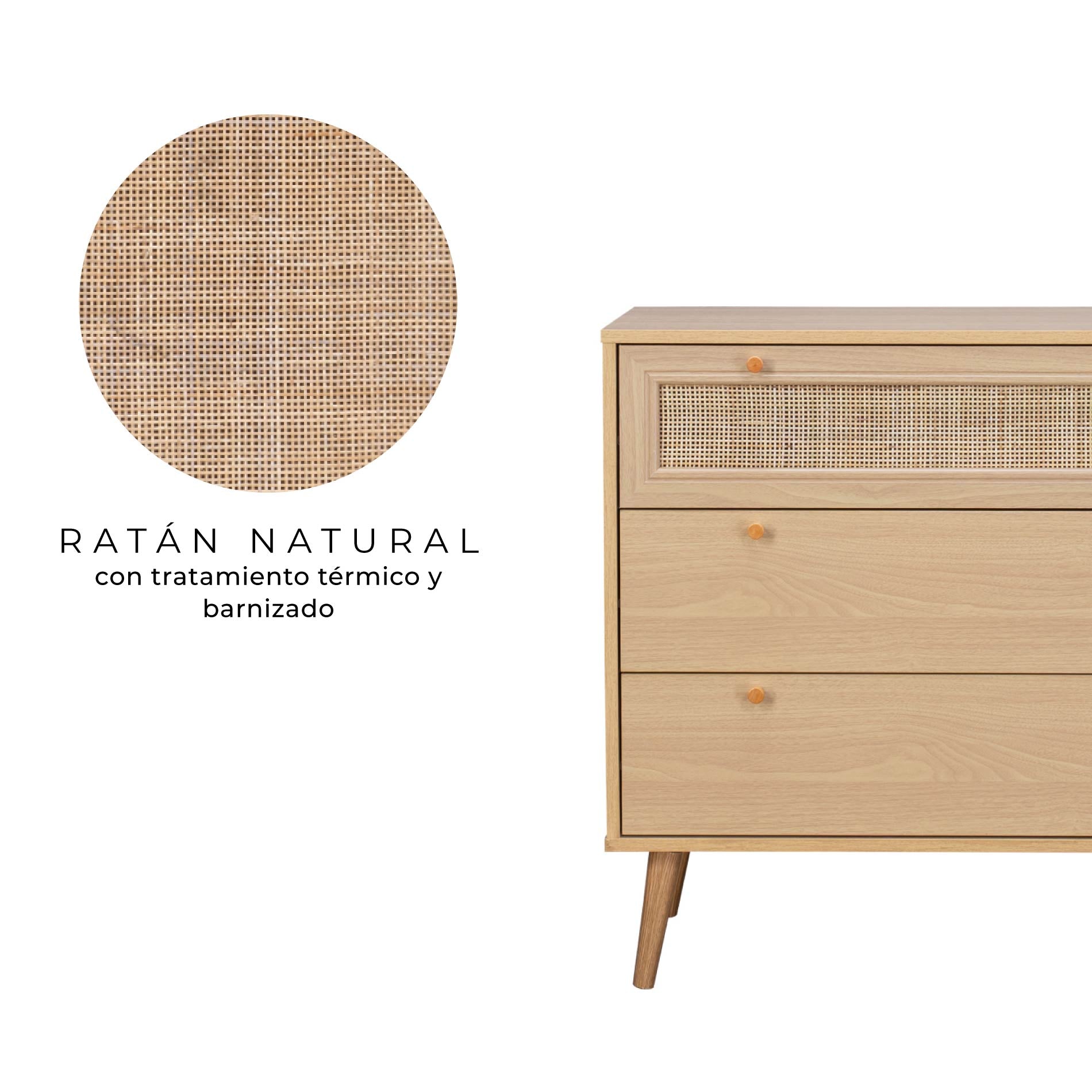 Incorpora esta moderna cómoda con ratán en tu hogar y dale personalidad a tus espacios. Gracias a su material natural y colores claros, es ideal para obtener un estilo decorativo cálido y artesanal. Podrás colocarla en tu sala, habitación o entrada, es un mueble muy versátil.