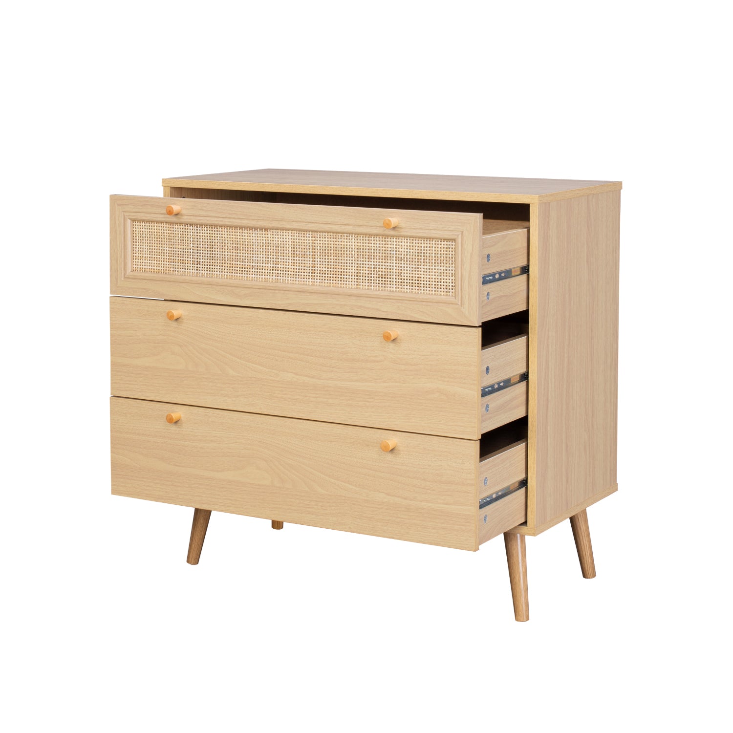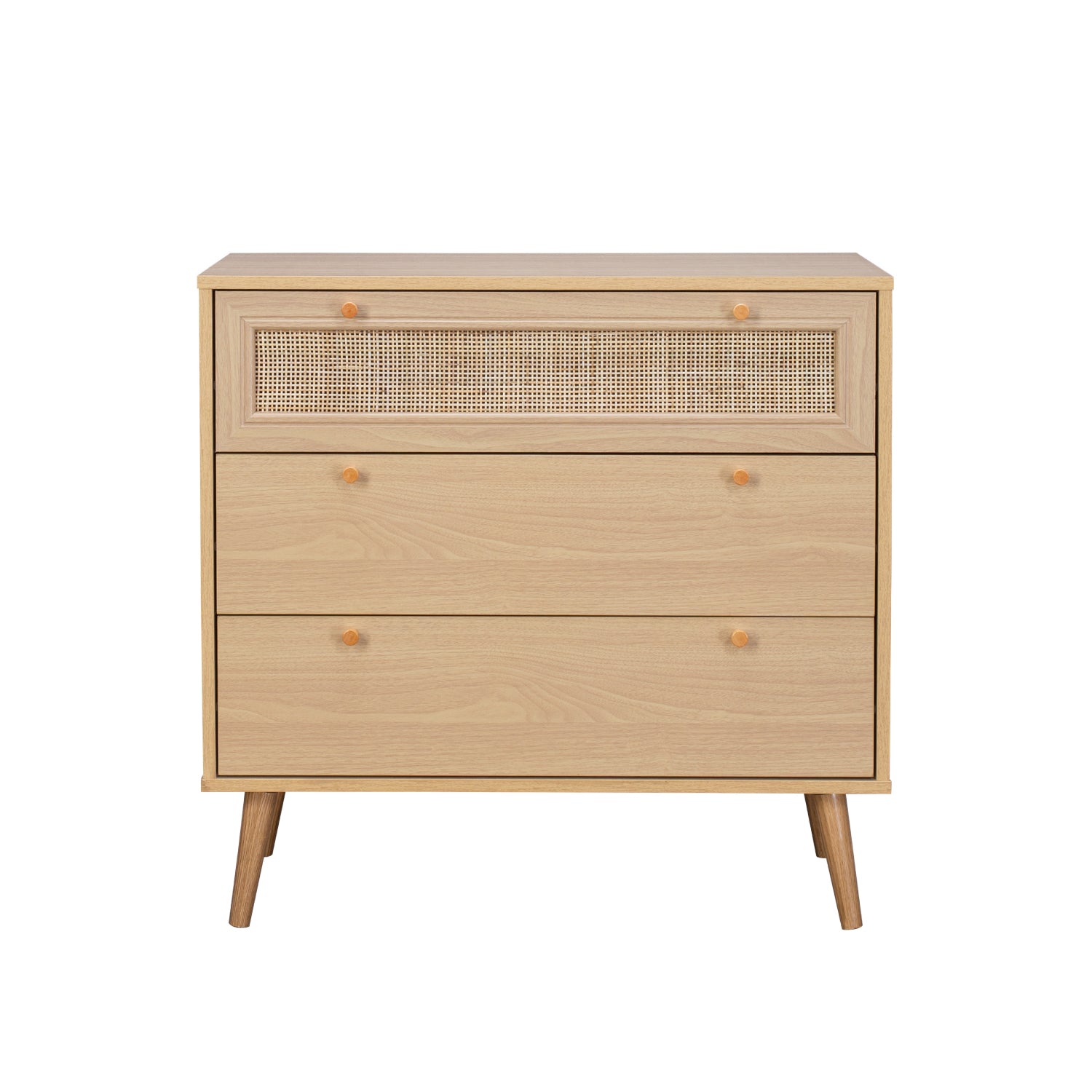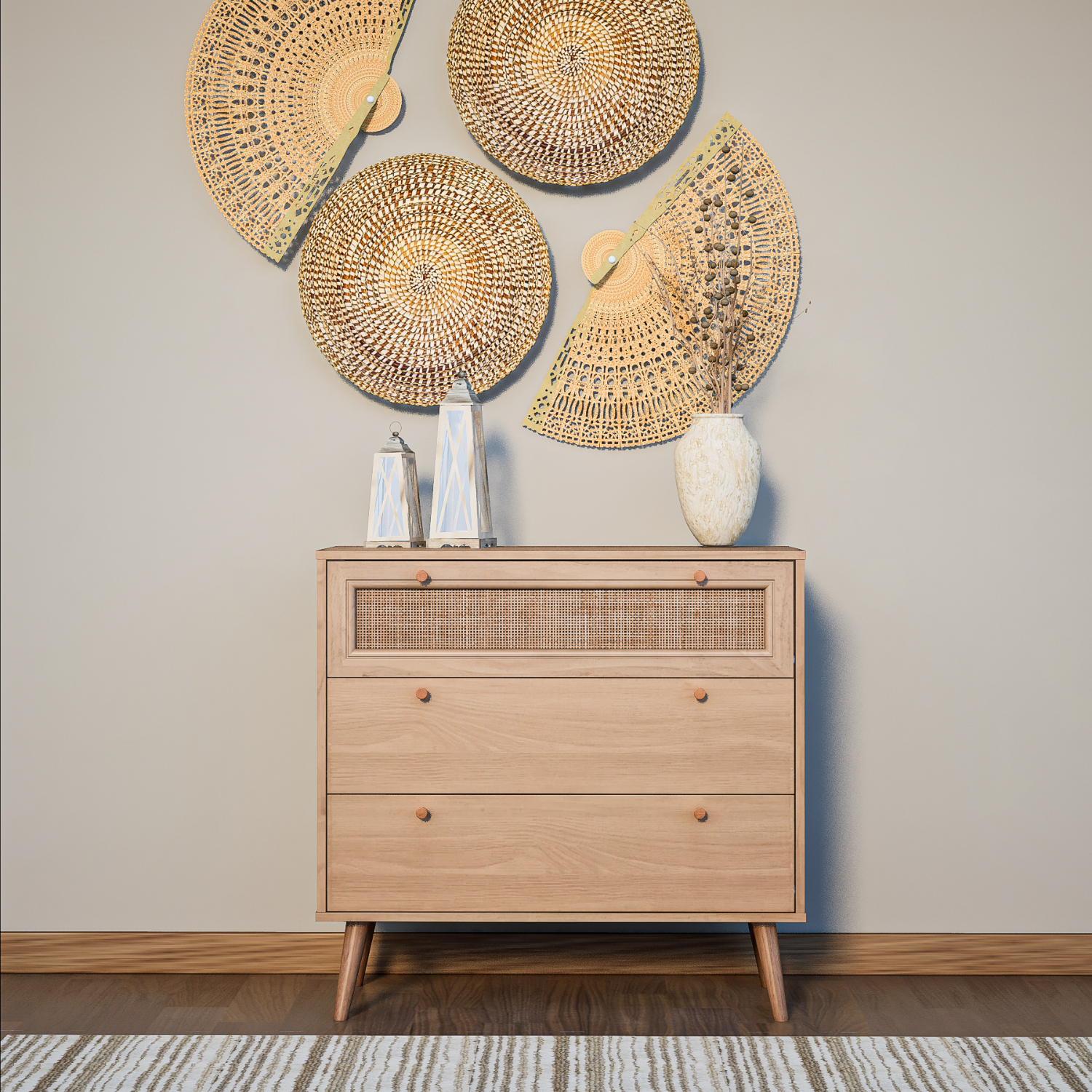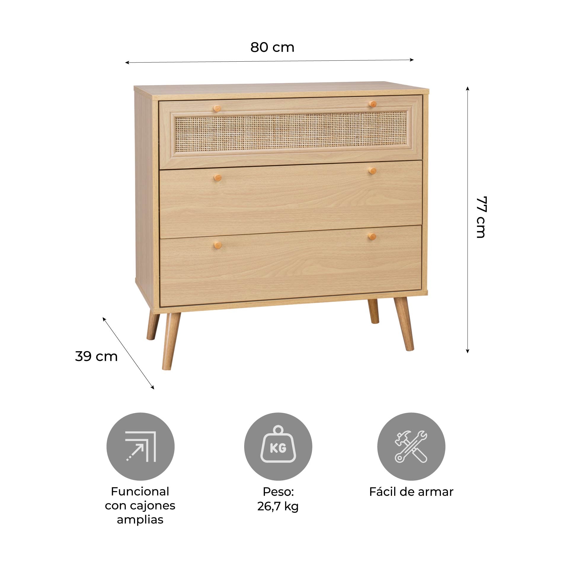 Incorpora esta moderna cómoda con ratán en tu hogar y dale personalidad a tus espacios. Gracias a su material natural y colores claros, es ideal para obtener un estilo decorativo cálido y artesanal. Podrás colocarla en tu sala, habitación o entrada, es un mueble muy versátil.