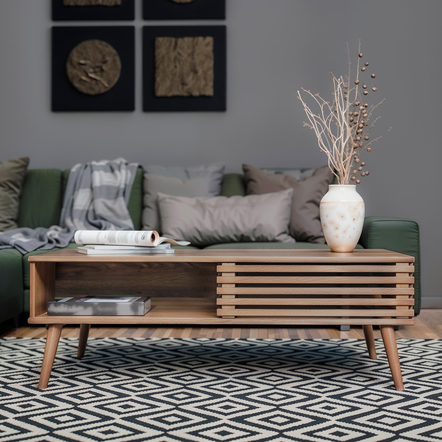 Dale un toque diferente a tu sala con esta mesa de centro retro con detalles de varillas y patas cónicas. Gracias a su versátil diseño podrás utilizarla también como mesa auxiliar o mesa de café, te permitirá crear el espacio perfecto para compartir momentos agradables.
