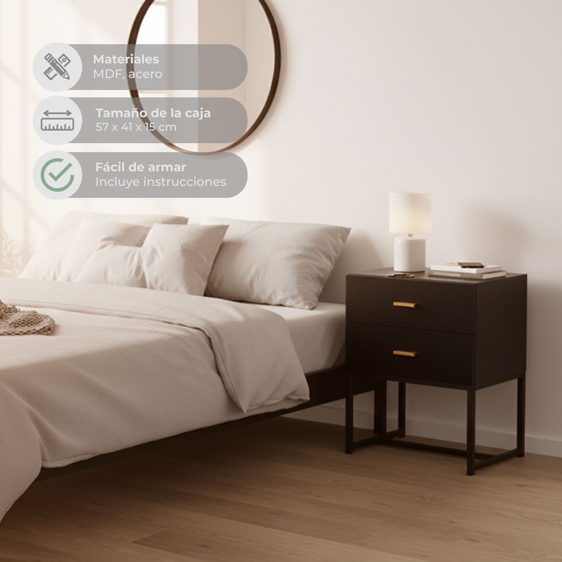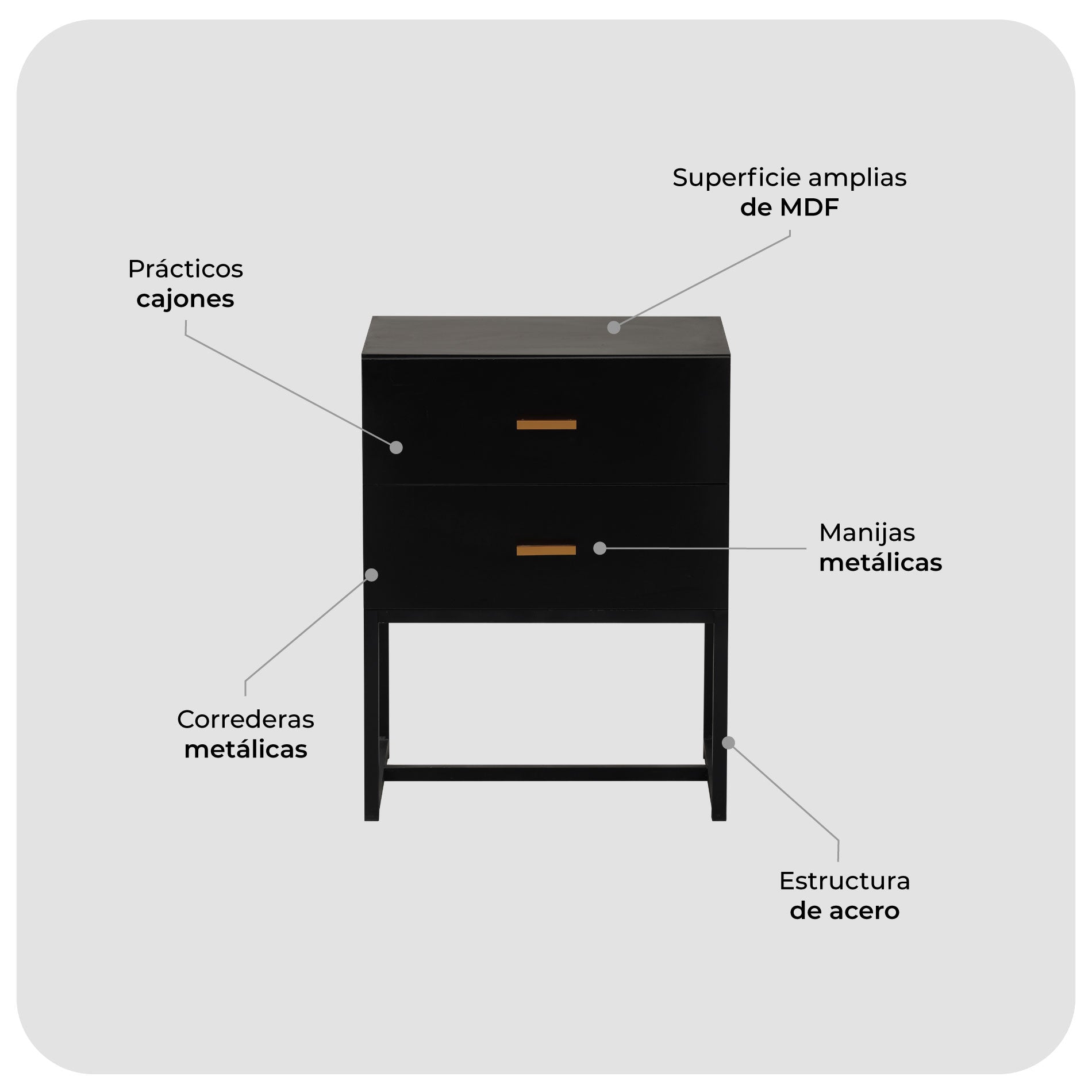 - Cuenta con dos prácticos cajones con manija y rieles metálicos para asegurar una apertura y cierre suave