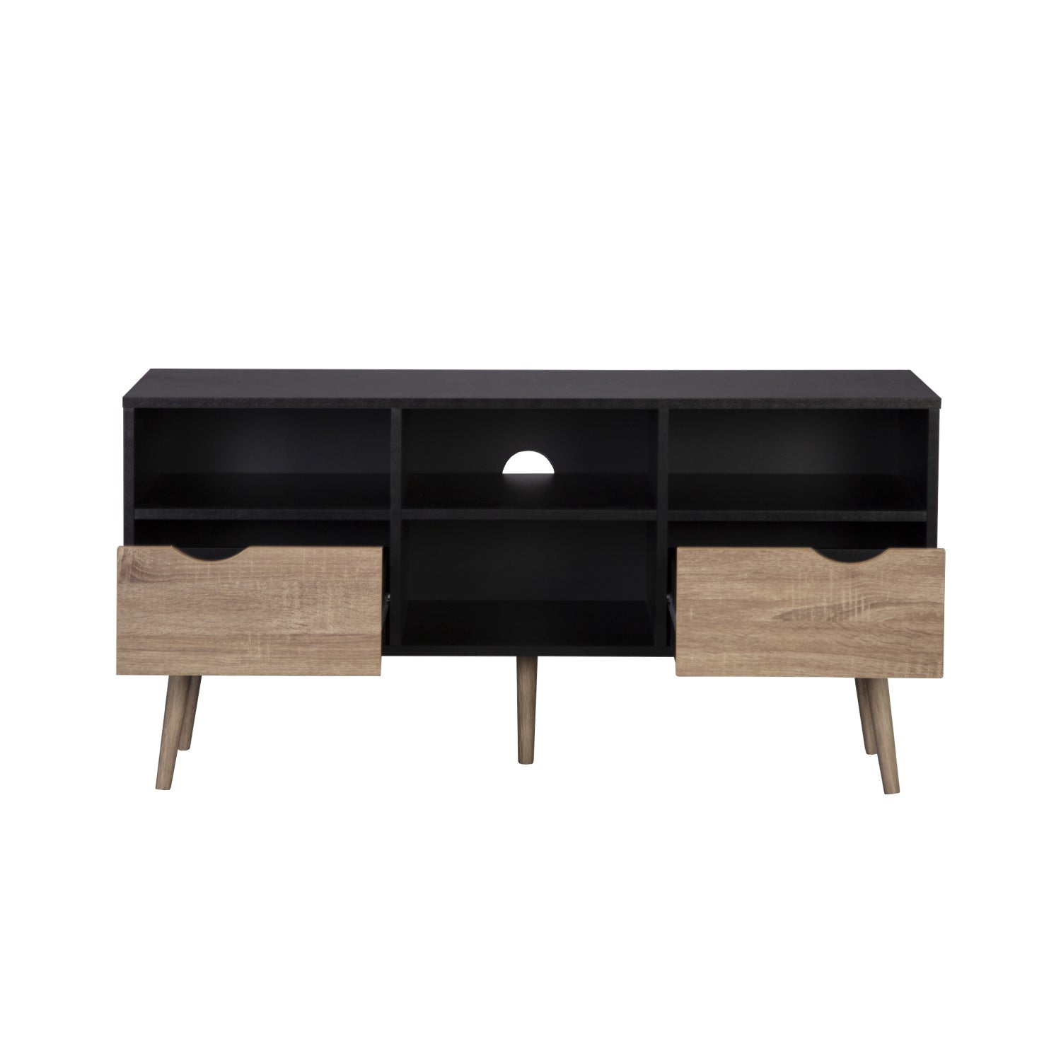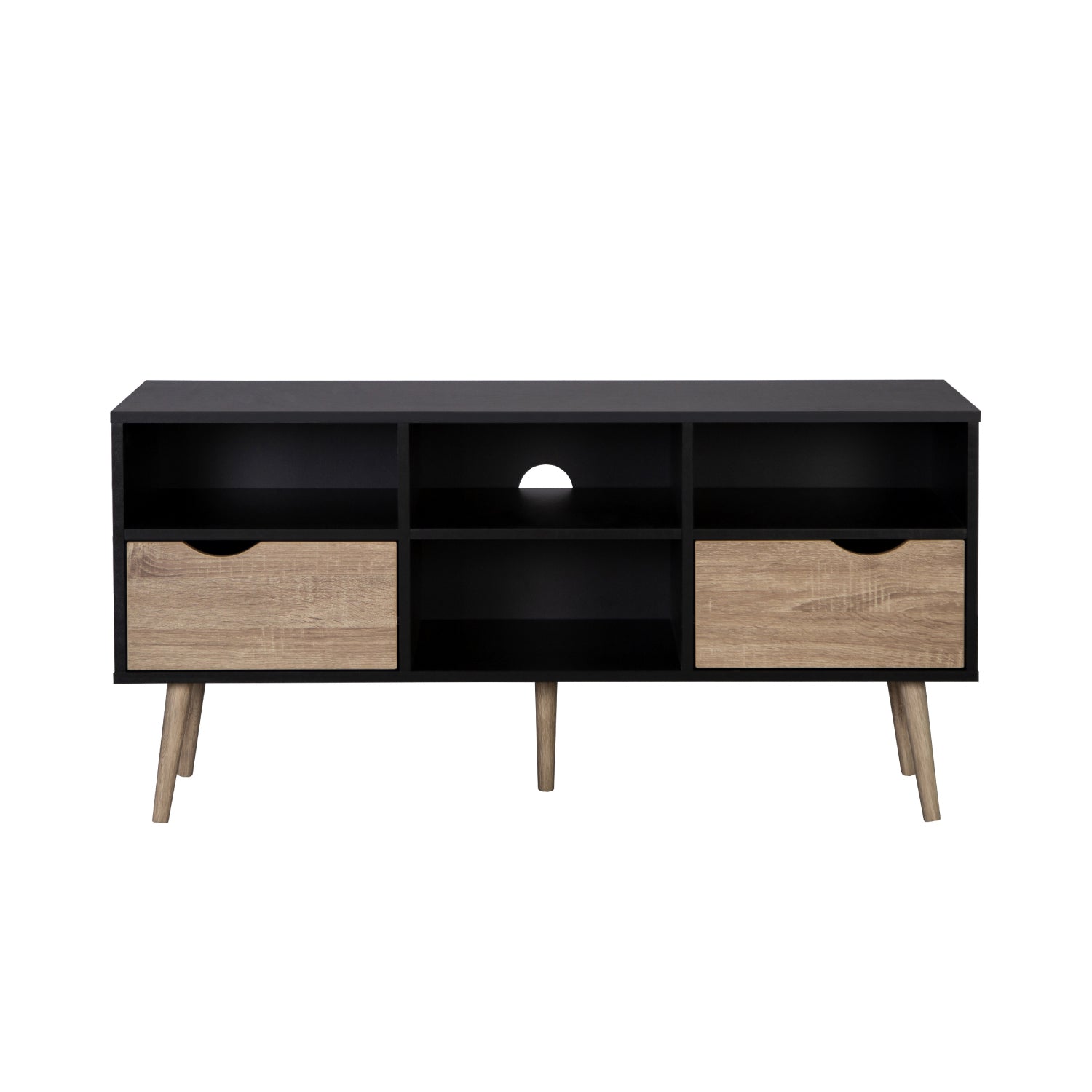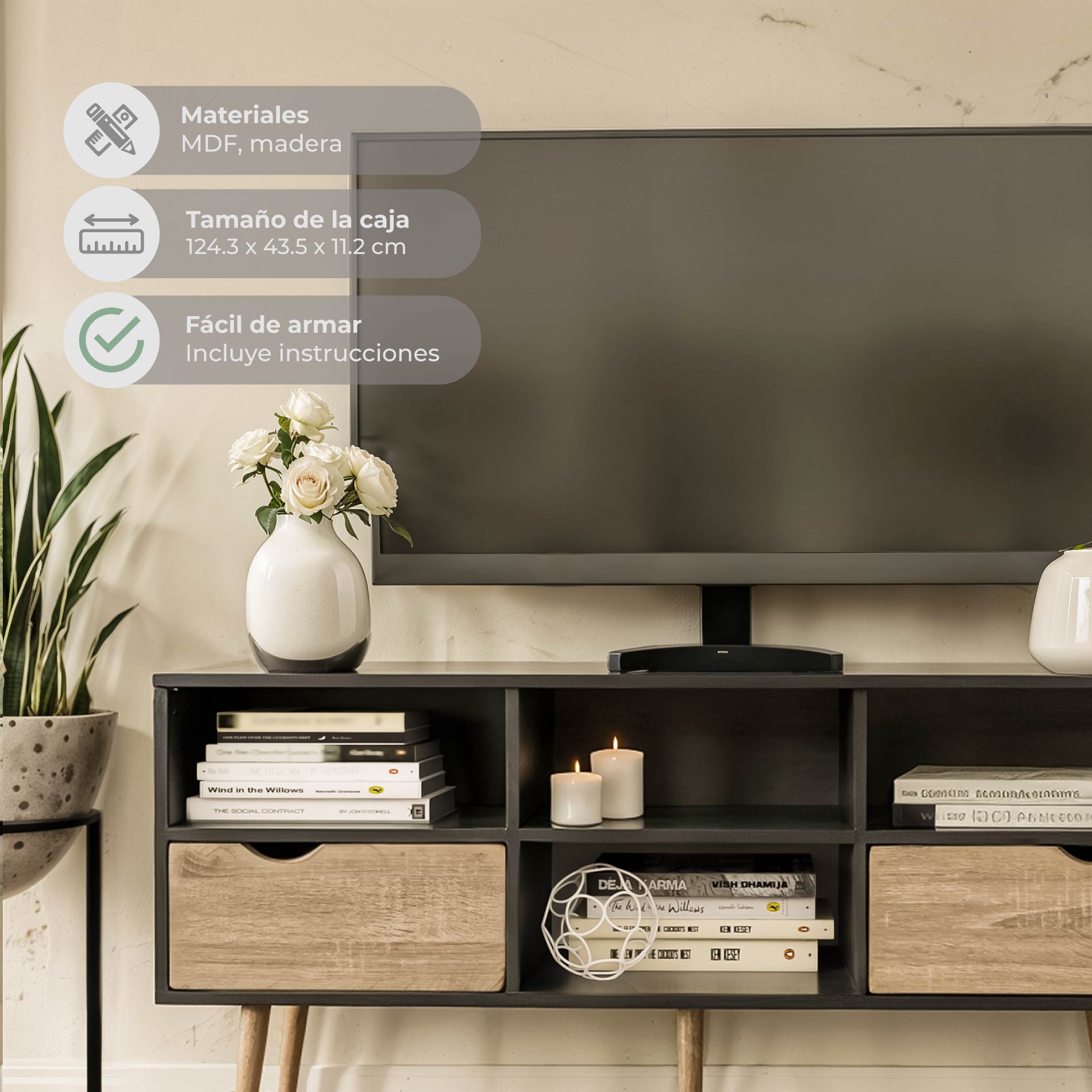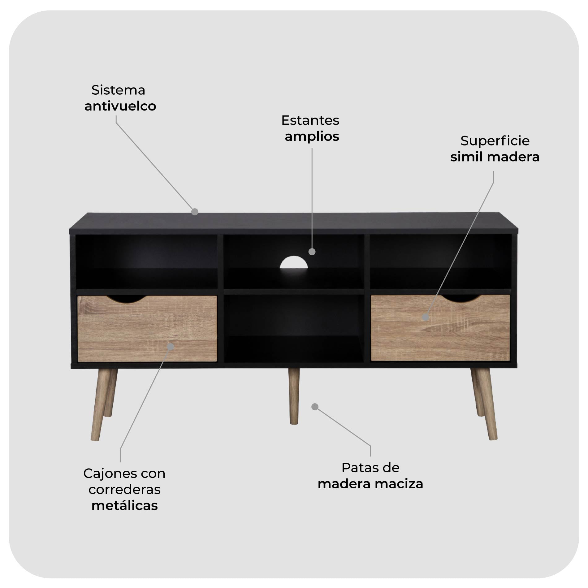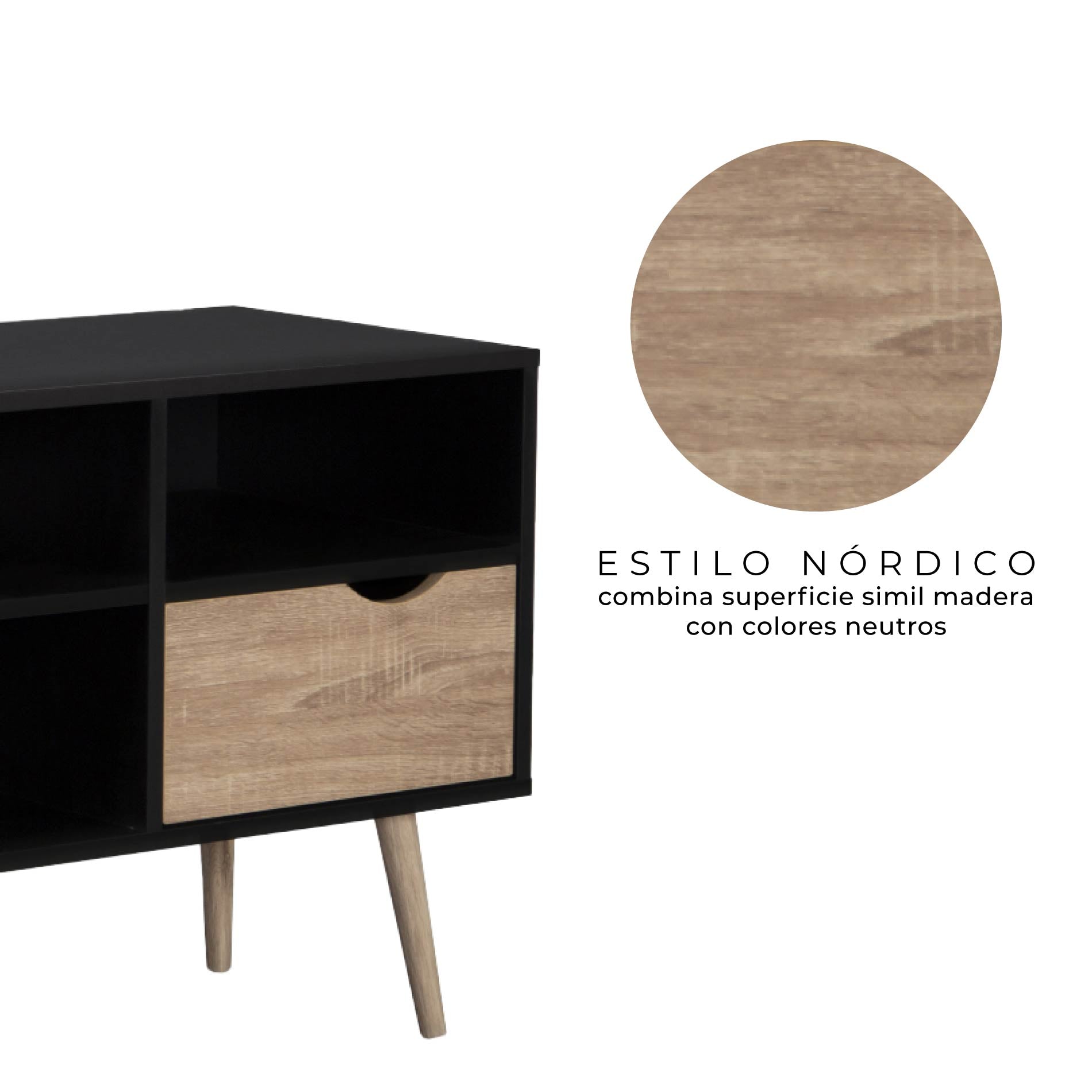 Disfruta de este práctico centro de entretenimiento estilo nórdico, ideal para colocar tu televisor, tu consola de videojuegos y además contar con espacio de almacenamiento extra para mantener tus espacios ordenados.