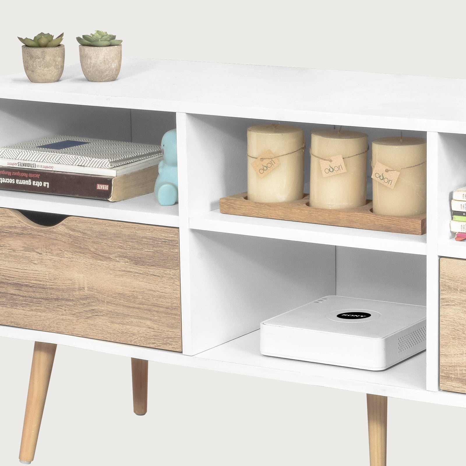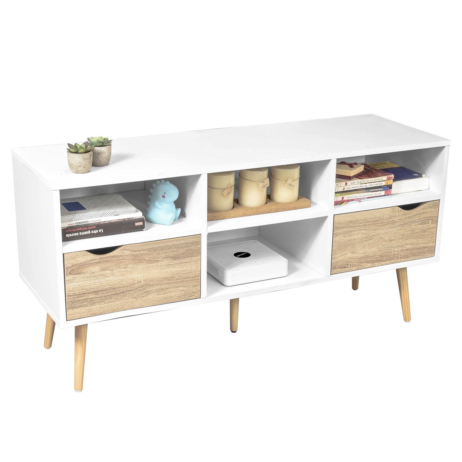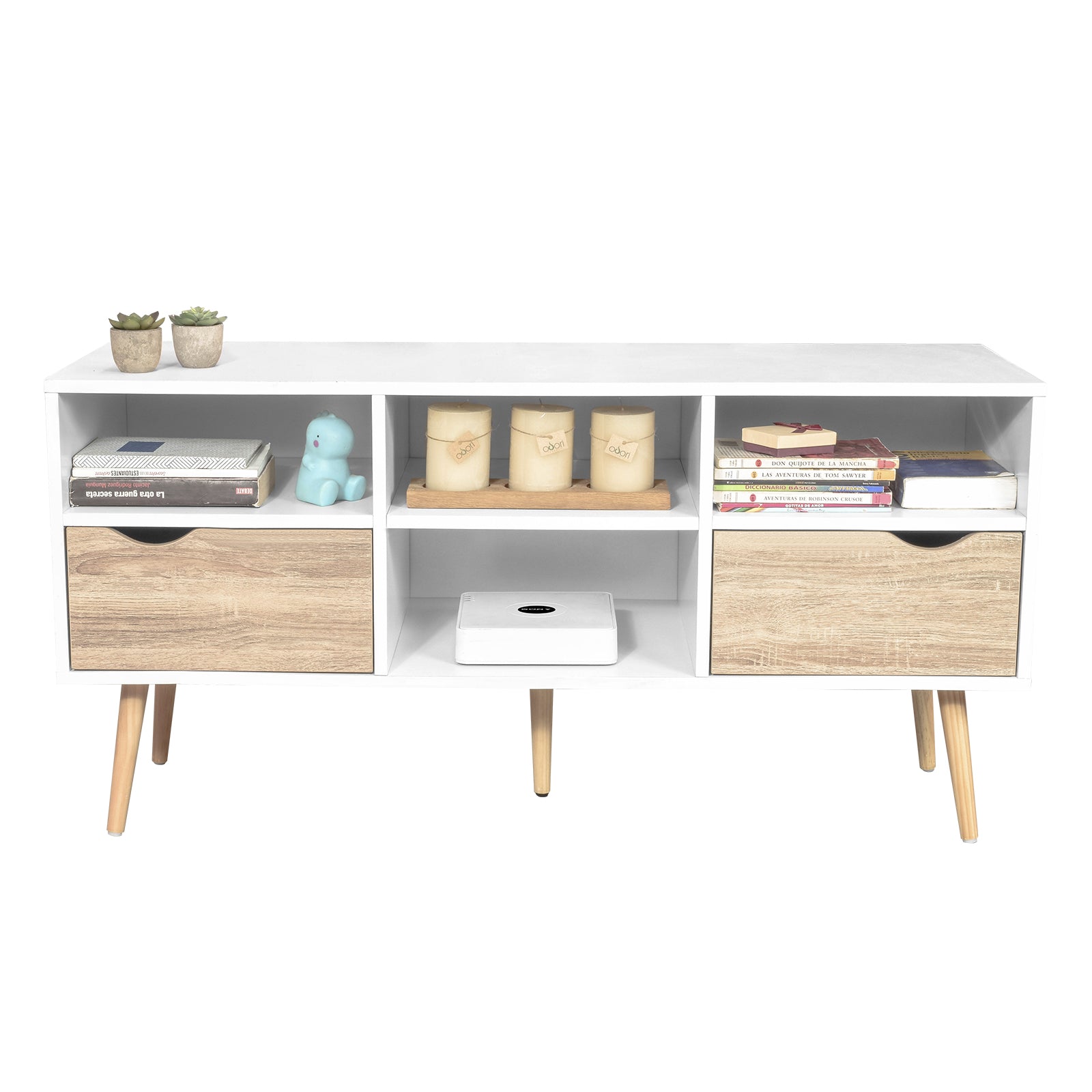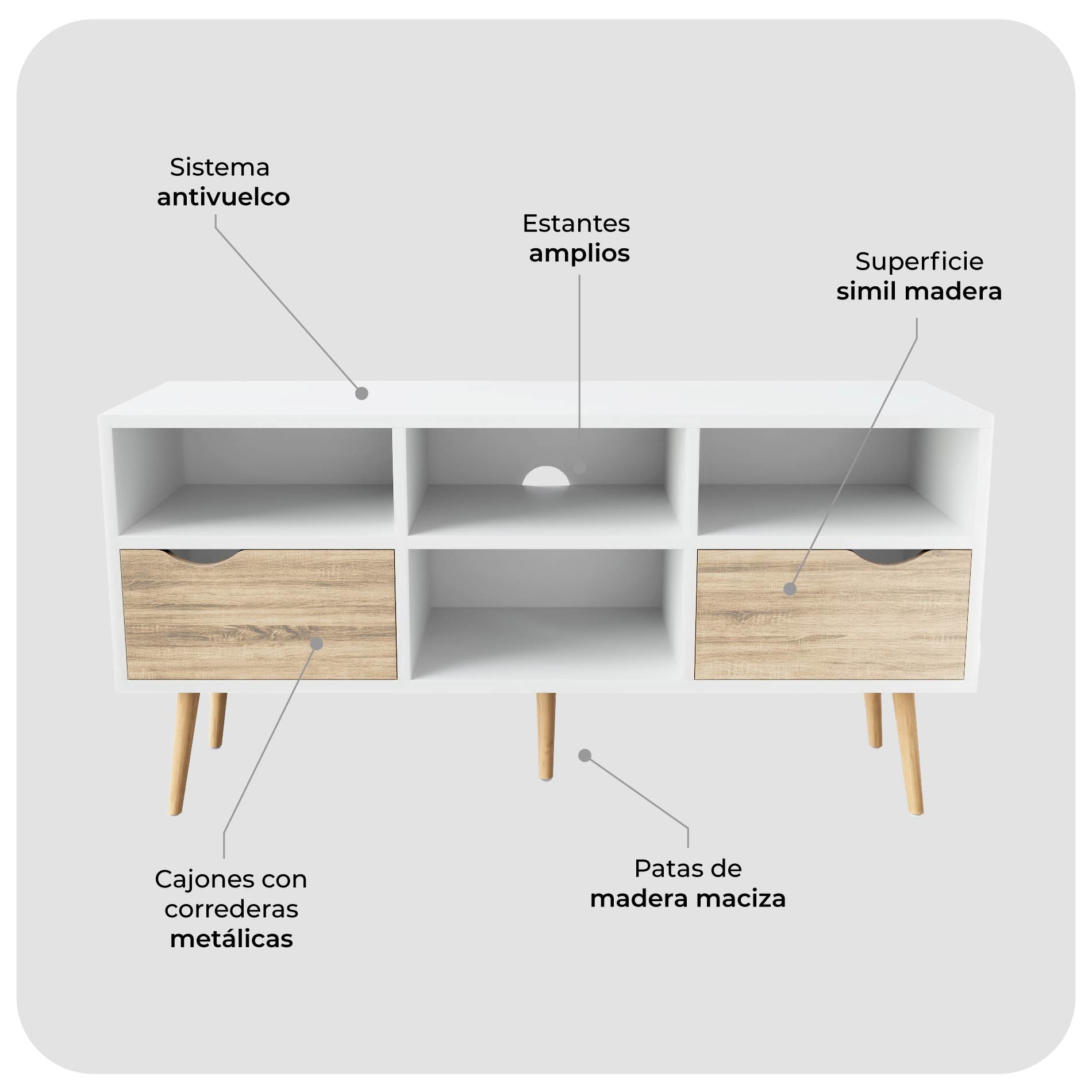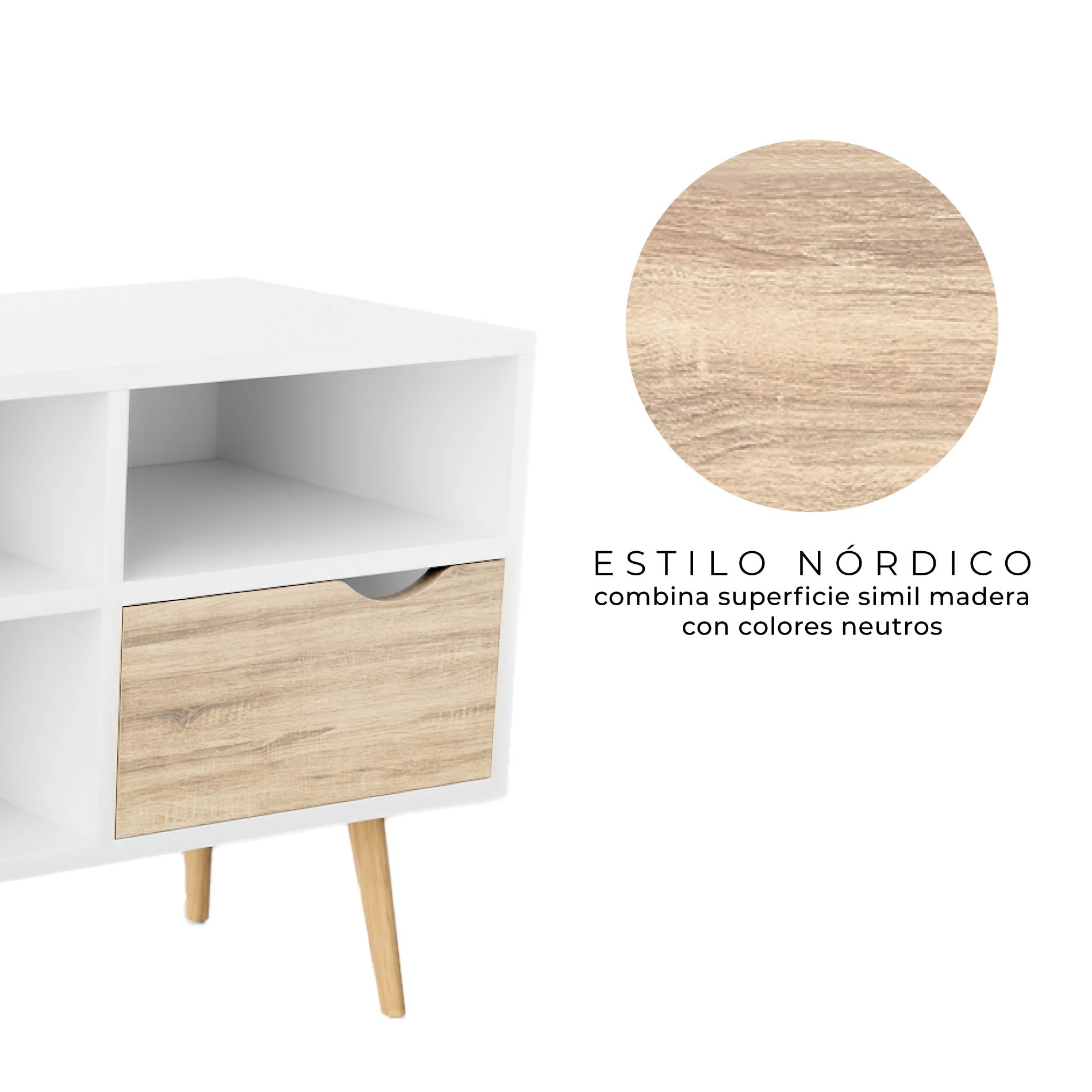 Disfruta de este práctico centro de entretenimiento estilo nórdico, ideal para colocar tu televisor, tu consola de videojuegos y además contar con espacio de almacenamiento extra para mantener tus espacios ordenados.