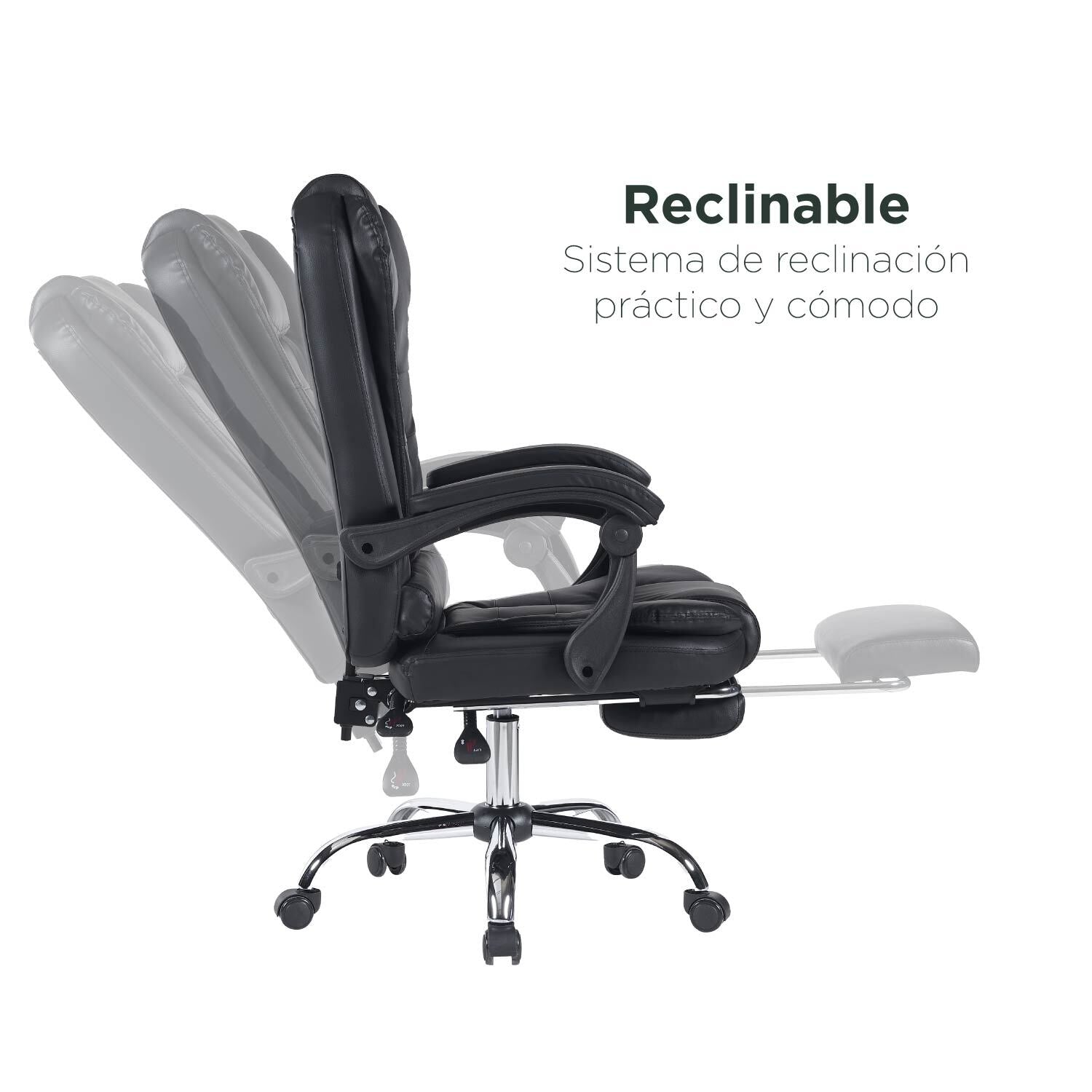 Obtén un silla de oficina diseñada ergonómicamente para cuidar tu postura sin sacrificar la comodidad y el estilo. Recubierta de cuero sintético negro, esta silla cuenta con apoyo lumbar, sistema de reclinación, apoyapiés incorporado y función de giro 360°, características claves para afrontar largas jornadas de trabajo y estudio.