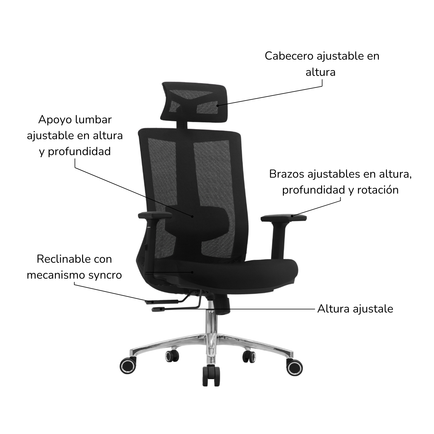 - Con mecanismo syncro que permite inclinar el espaldar y fijarlo en la posición deseada y sistema slider para regular la profundidad del asiento