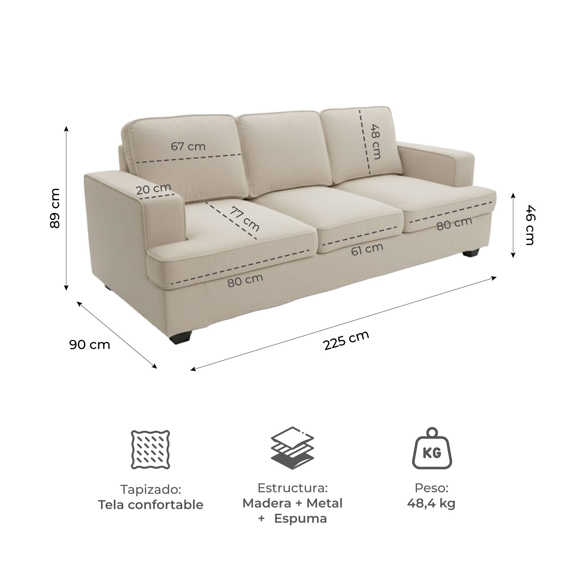 - Medidas del asiento: 77 cm profundidad x 13 cm de grosor x 46 cm de alto