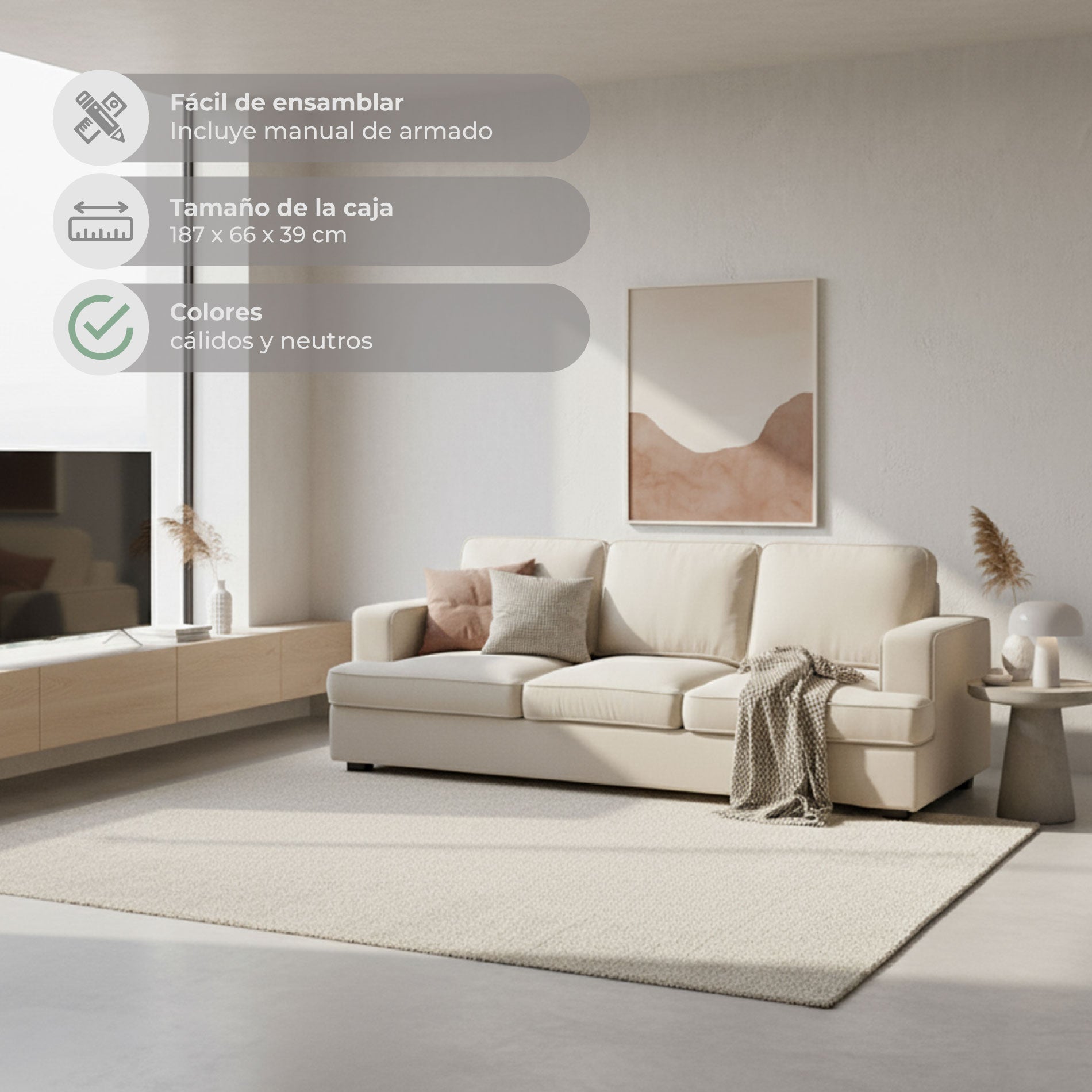 - Sofá de 3 cuerpos beige, diseño minimalista y funcional